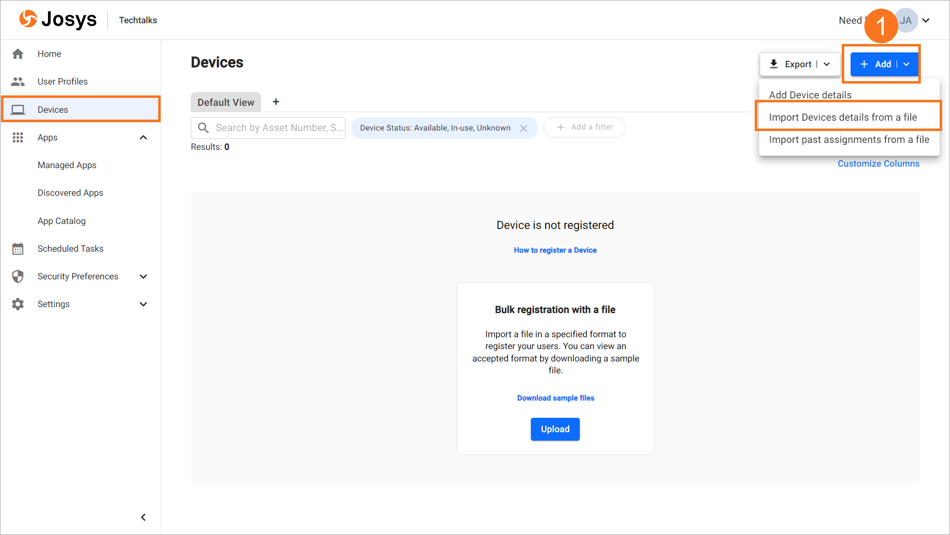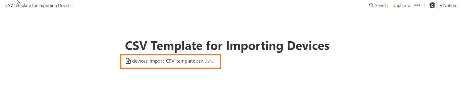 - Click Download a sample file to download a sample CSV file in which you can fill in the device details and upload.