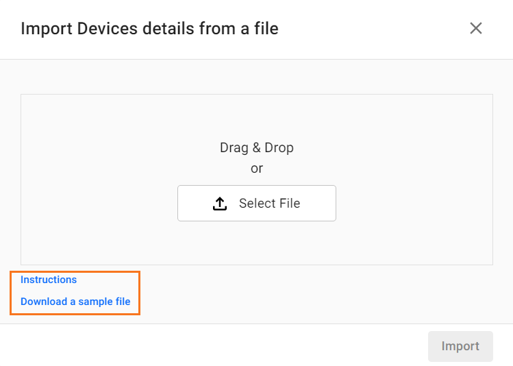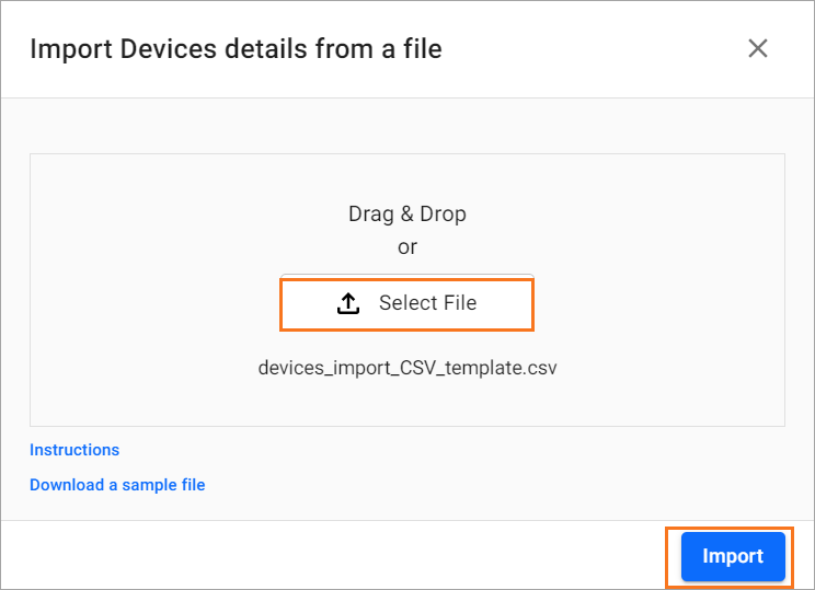 Step 6: After you enter the device details in the CSV file, import the file by dragging the file or clicking Select File on the following screen. Click Import to import the CSV file.