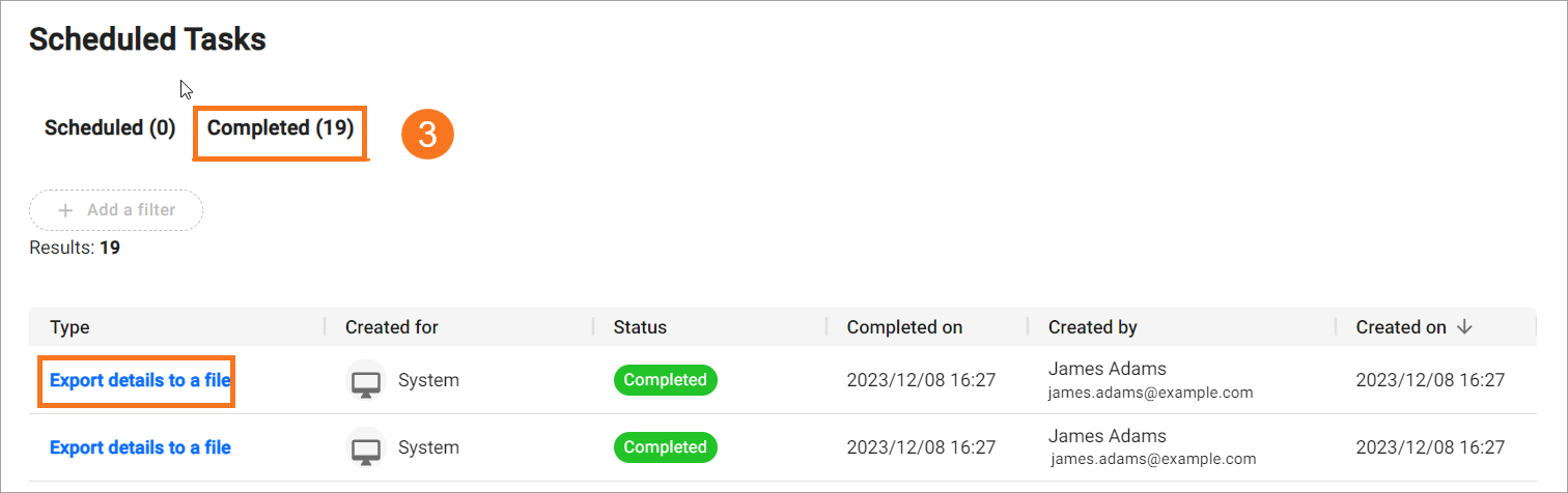 Step 3: The file starts downloading. You can track the progress and download the exported file from Scheduled Tasks. On the Scheduled Tasks screen, click the Completed tab and select Export details to a file to export the file.