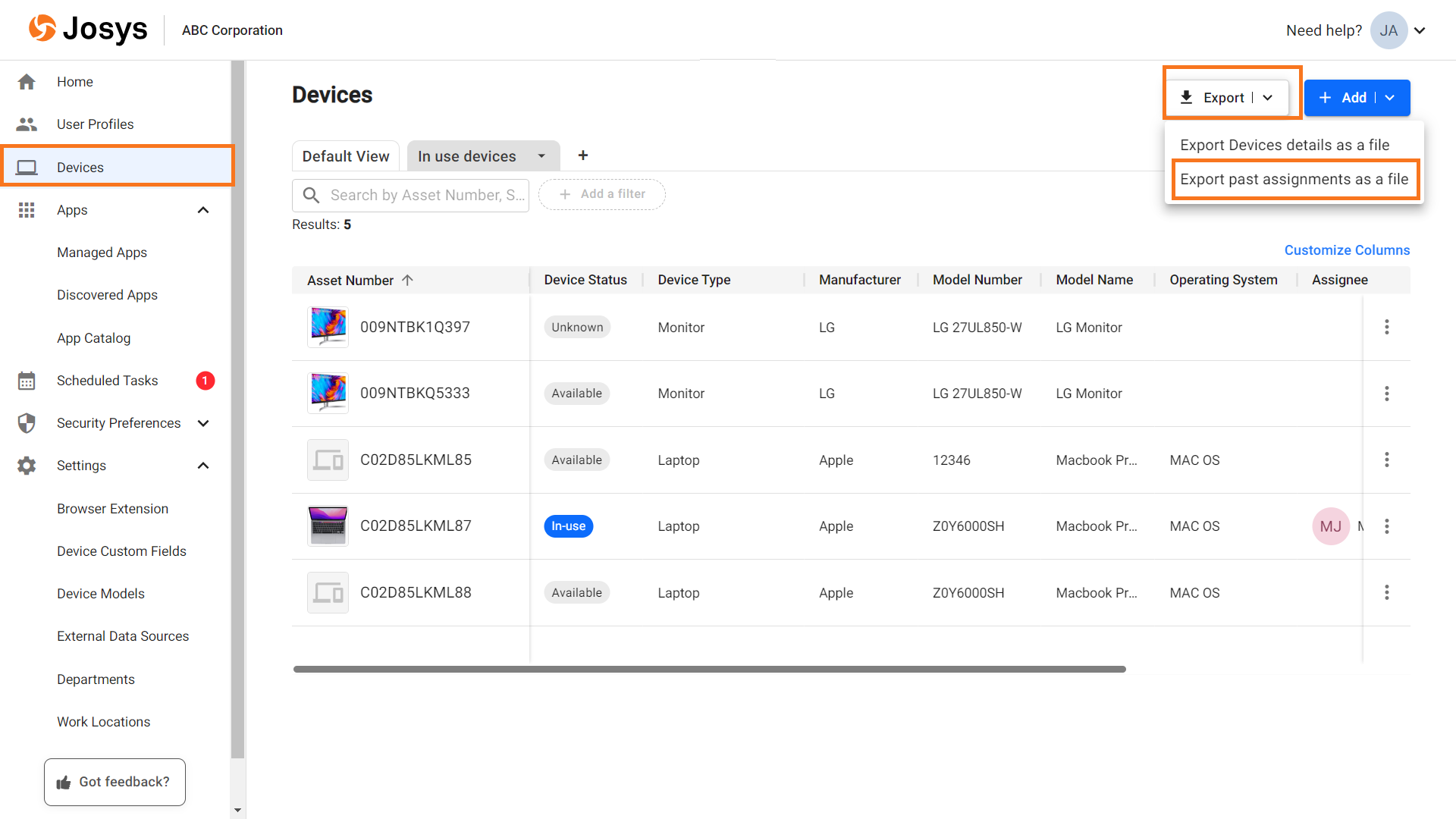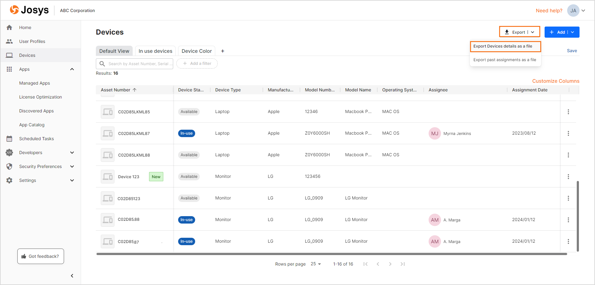 Josys allows you to export the bulk device data to a CSV File. The device details include the current device details or devices assigned in the past, based on your selection.