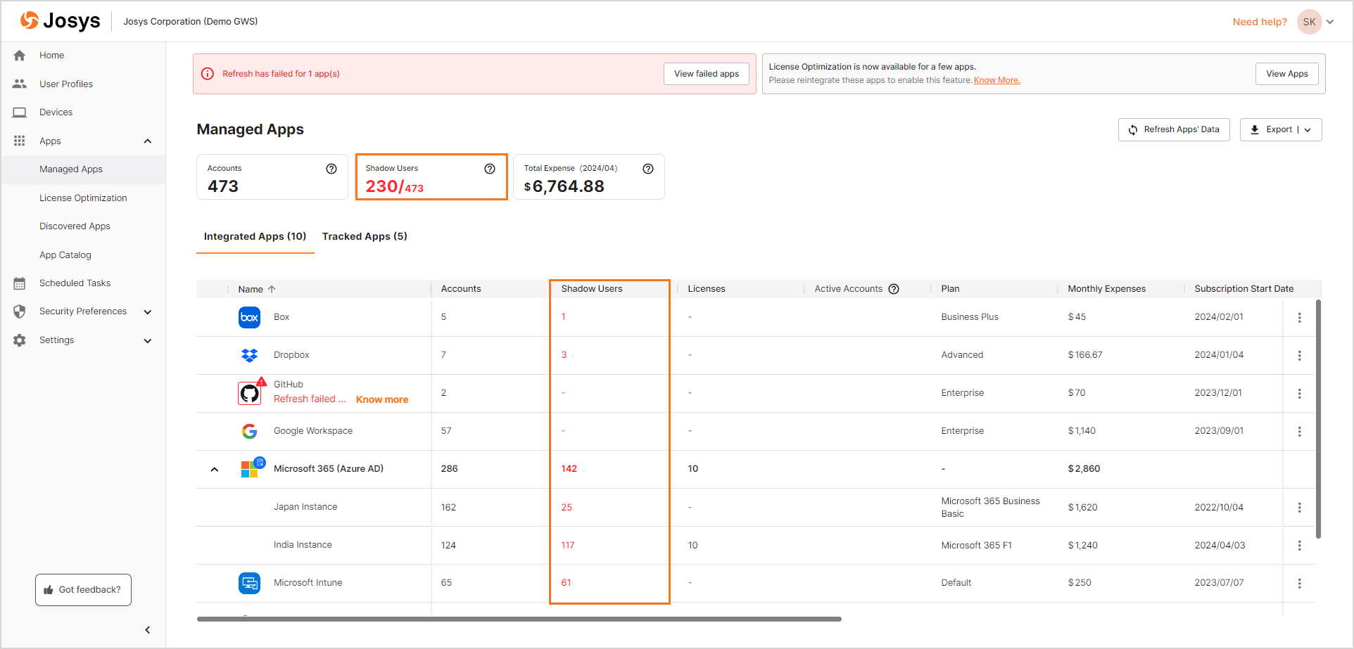 Managed Apps provides an overview of integrated applications and their associated user accounts. You can notice the shadow users from the following two indicators:
