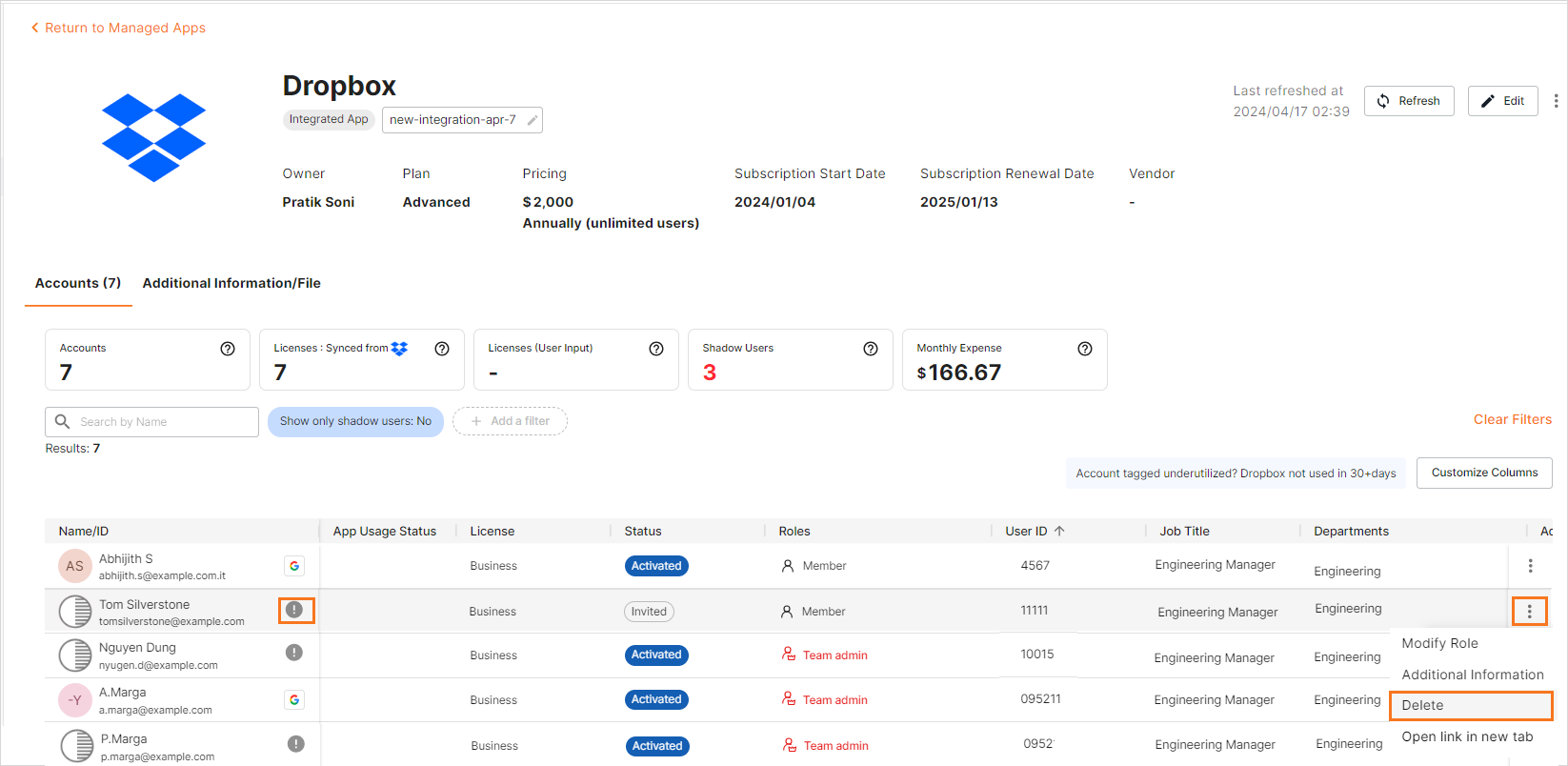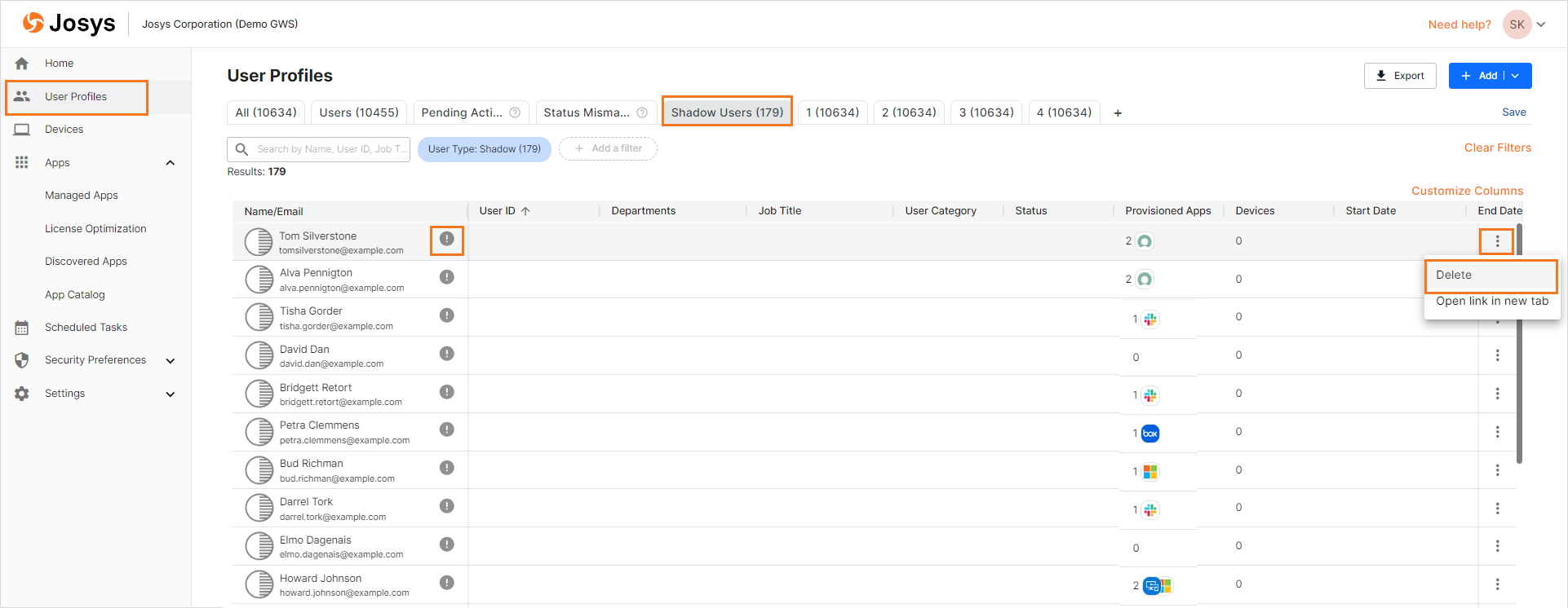 Step 2: A grey "!" icon denotes a shadow user. Click "Delete" against the corresponding shadow user to revoke access to that particular app. Alternatively, click a shadow user row to open the user profile details page. Perform the steps as detailed in the Managing Shadow Users from User Profiles.