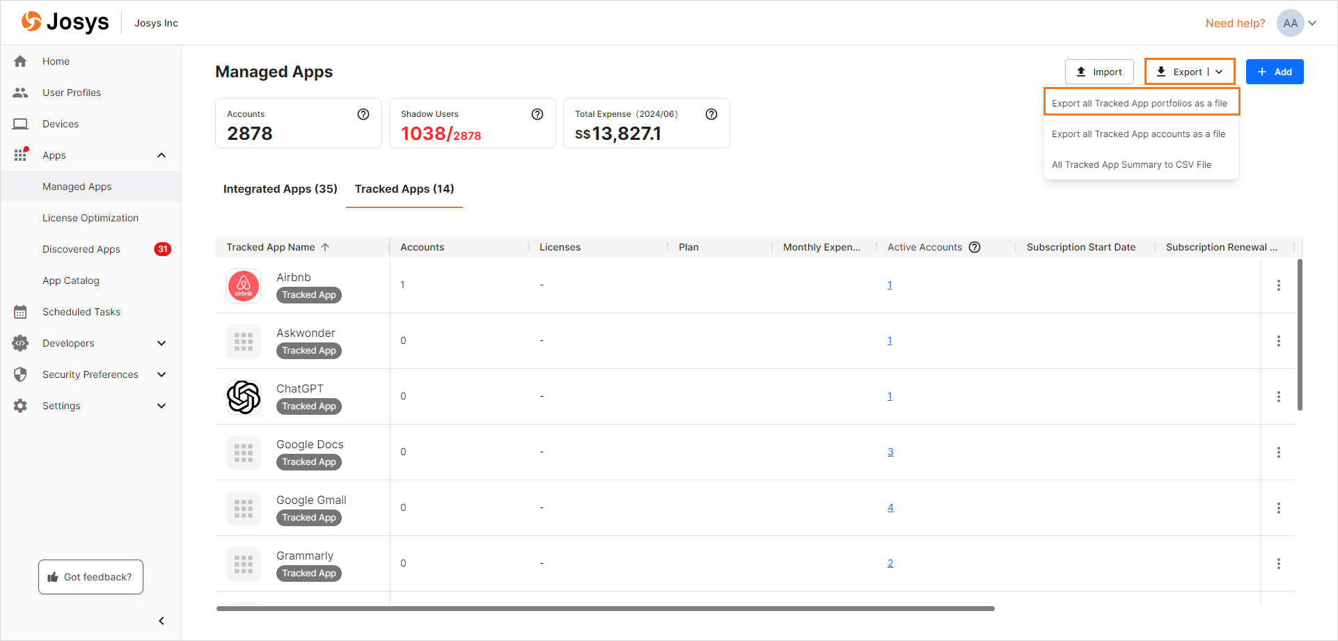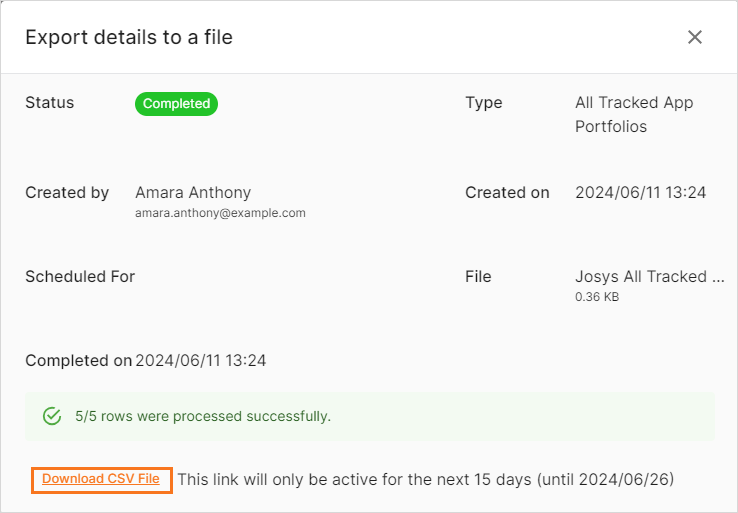 Exporting tracked app data to a CSV File allows you to analyze the apps. Josys offers the capability to export the following types of CSV files for tracked app data.