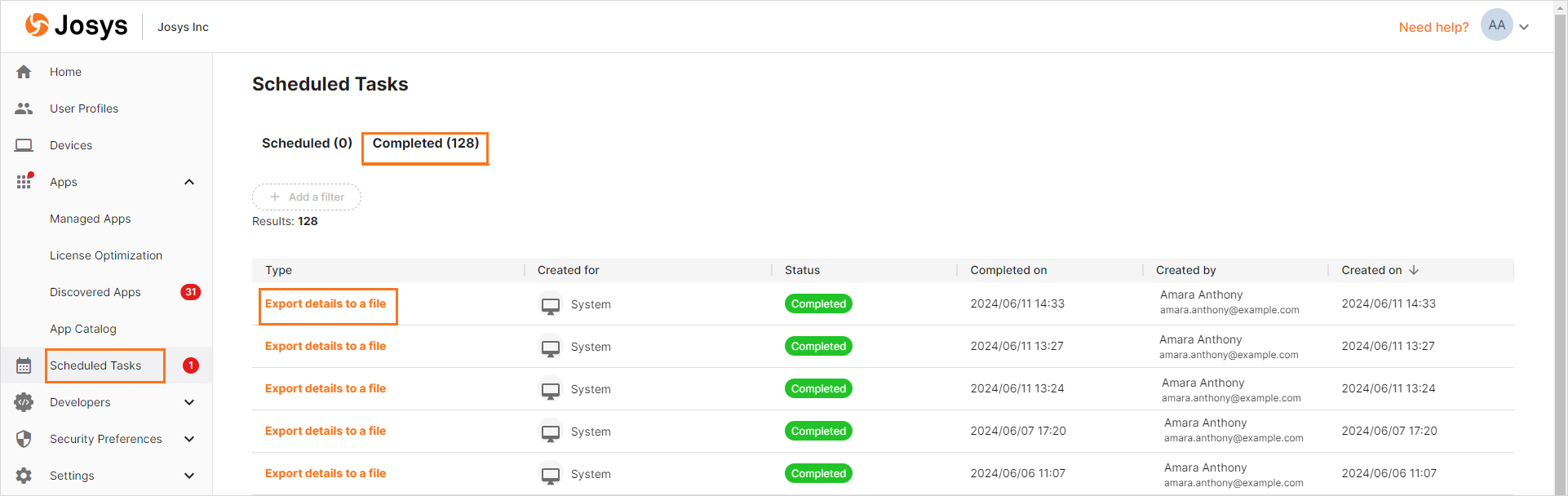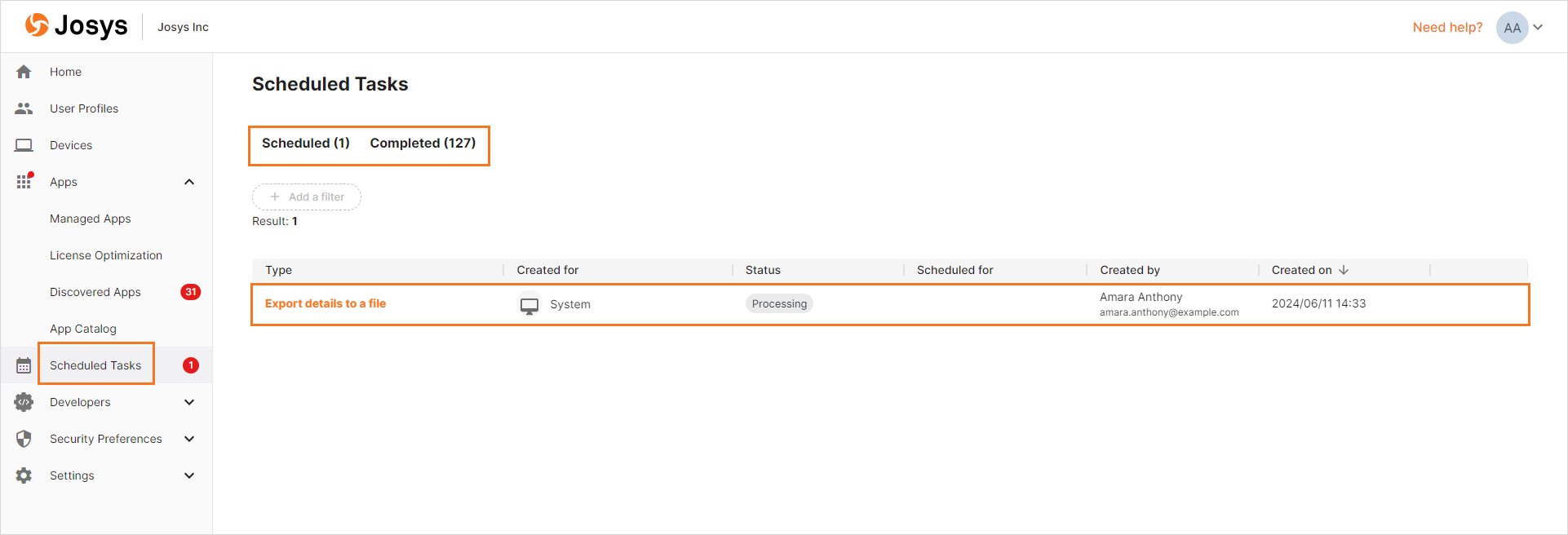 Step 3: The download of the file begins. You can track the progress and download the exported file from Scheduled Tasks. From the Scheduled tab, you can view the progress, whereas you can download the file from the Completed tab.