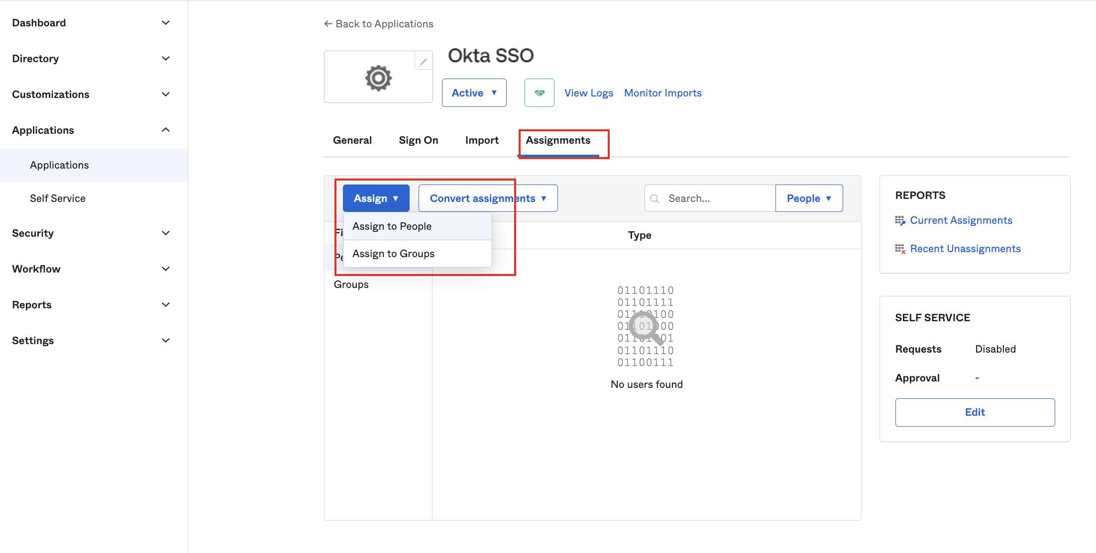 Step 11: In Okta, configure users or groups to utilise SSO. From the Assignments tab, click Assign, then select either People or Group to add them.