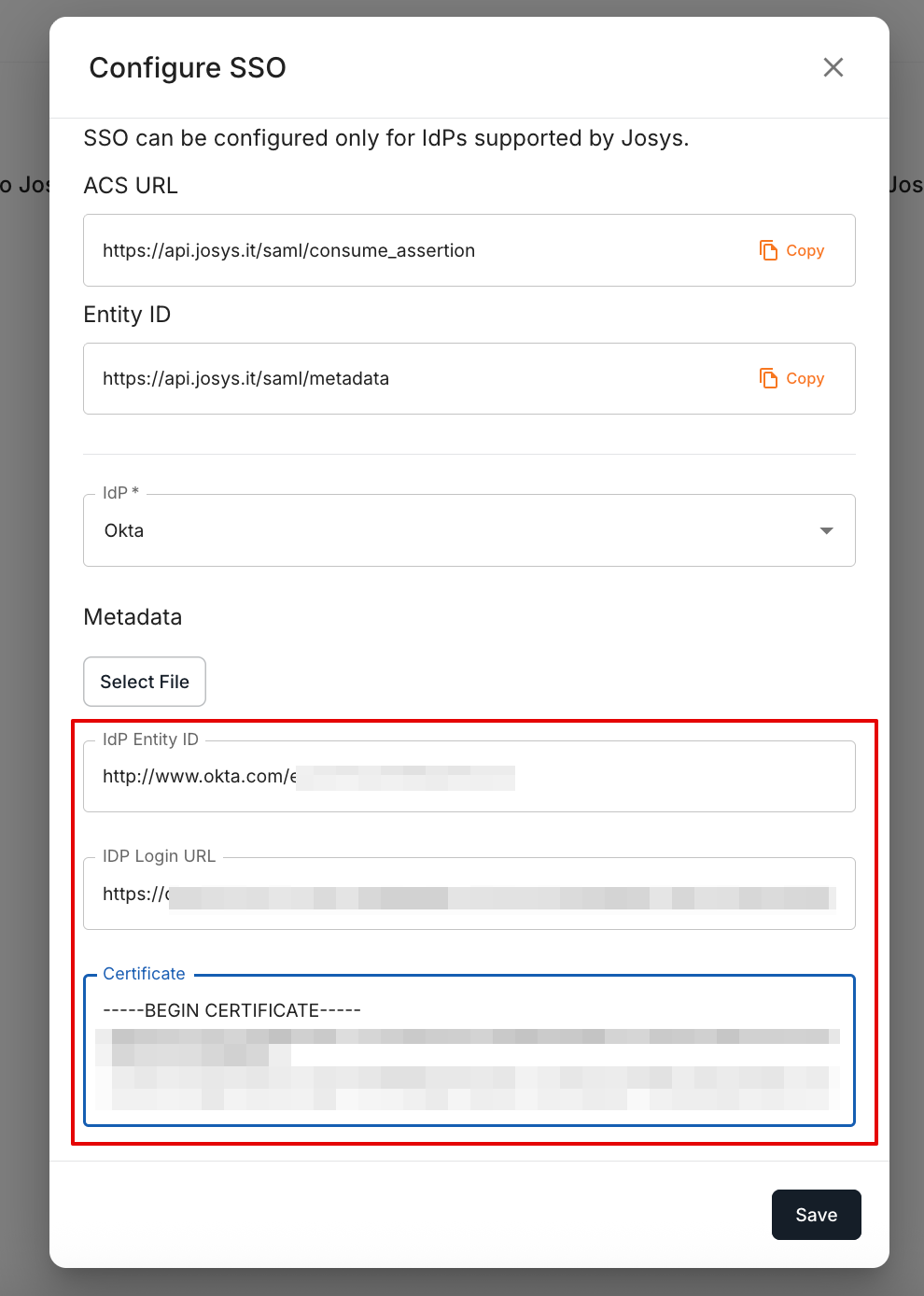 (To configure from a file, save the IDP metadata displayed under Optional at the bottom of the screen as an XML file and upload it to Josys.)