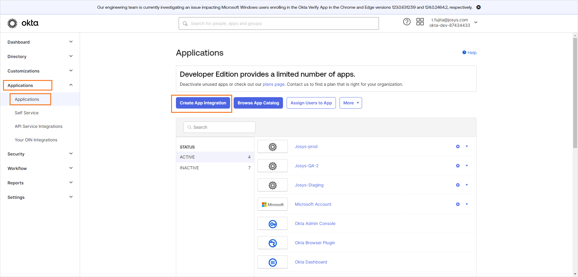 Step 1 : Log in to Okta using an admin account. Navigate to the Applications menu and select Applications .