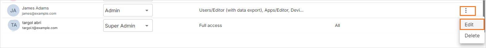- Devices/Editor (with data export): Grants full access to all the devices. The user can fully access the devices, along with the ability to export the device's data.