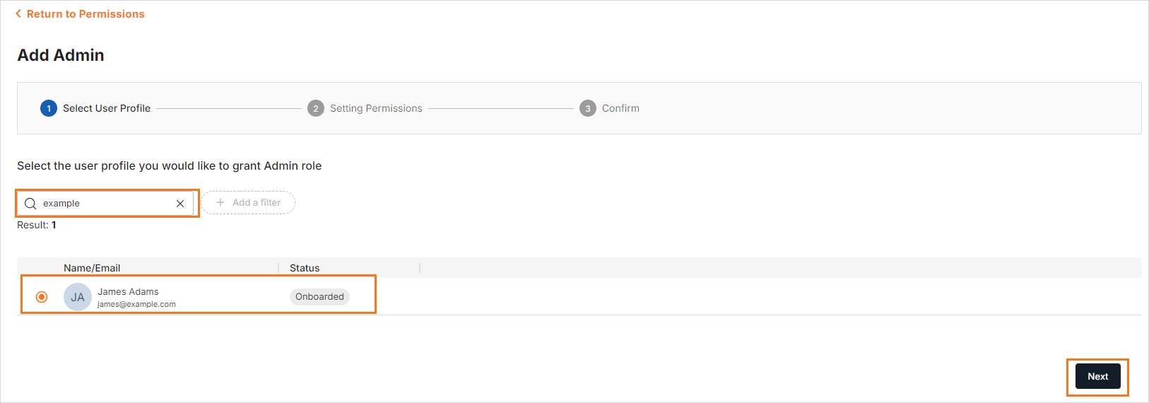 Step 5: A list of all onboarded users is displayed, allowing you to select a user to assign the Admin role.