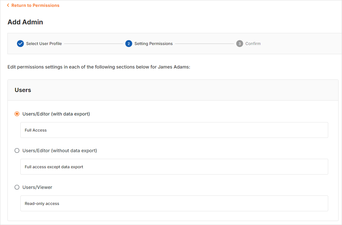 - Users/Editor (without data export): You can allow the user to fully manage the user profiles, excluding the ability to export the user profile data.