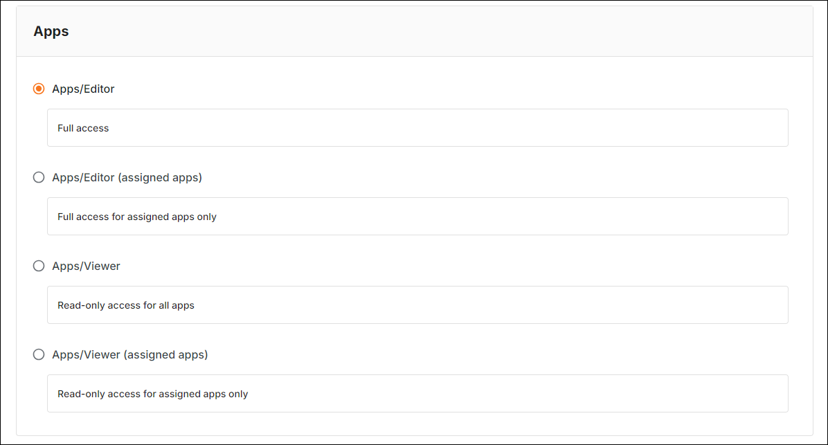 - Apps/Editor (assigned apps): You can allow the user to fully access only the assigned apps.