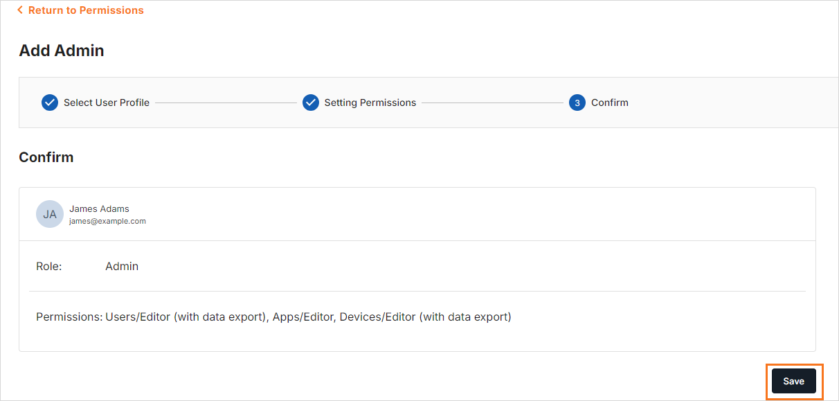 Step 7: On the following screen, select permission to grant access to the User Profile, Apps, and Devices.