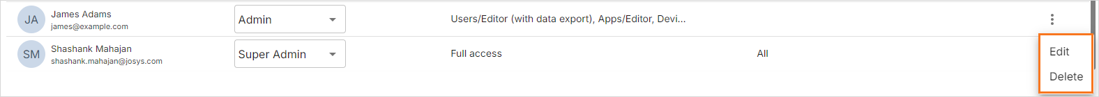 Step 3: Click and select Edit to modify the permission assigned to the Admin role, and Save or select Delete to remove the Admin role from the user.