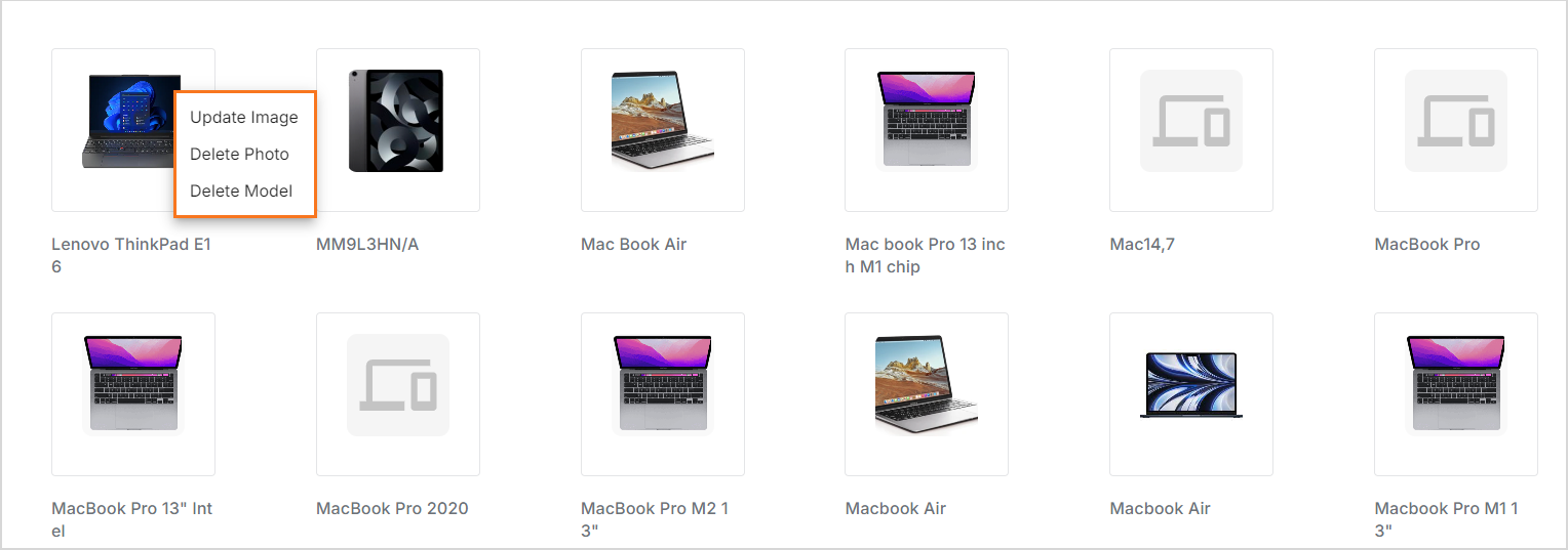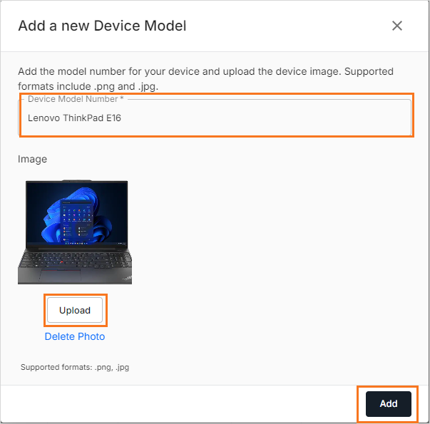 - Image: Click Upload to select and upload a device model image for the device model. To remove an existing model image, click Delete Photo. Note that only .png and .jpg image formats are supported.