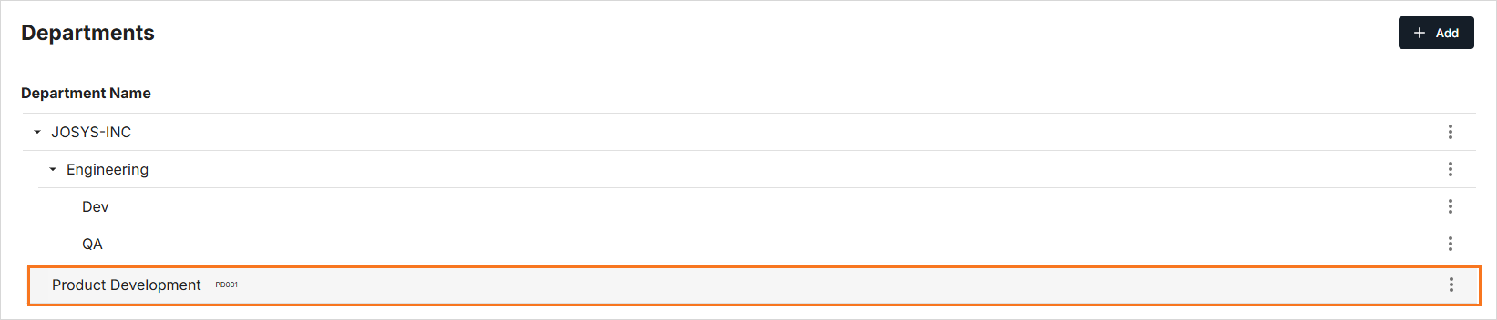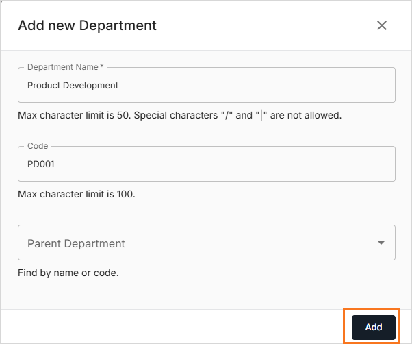 - To create a Product Development as the parent department, do not select any option from the Parent Department dropdown menu. In this case, the Product Development will be displayed as below: