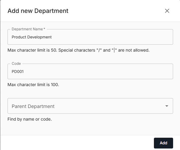 - To create a Sub-department: Select the respective parent department from the dropdown.