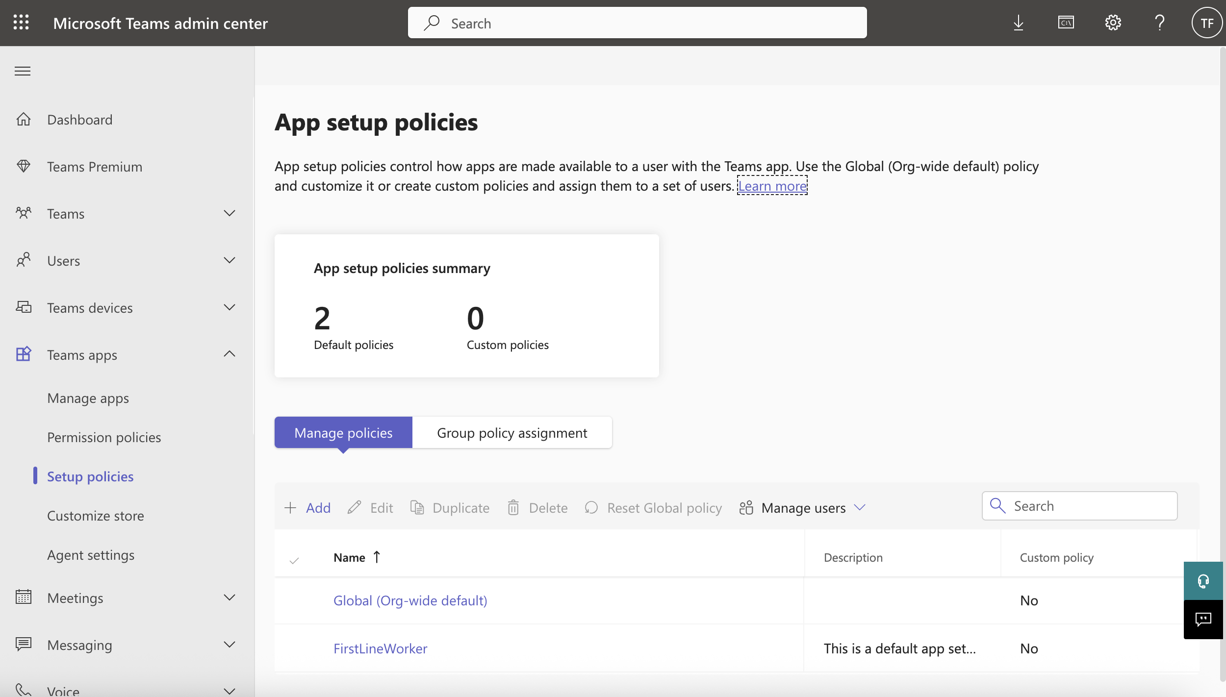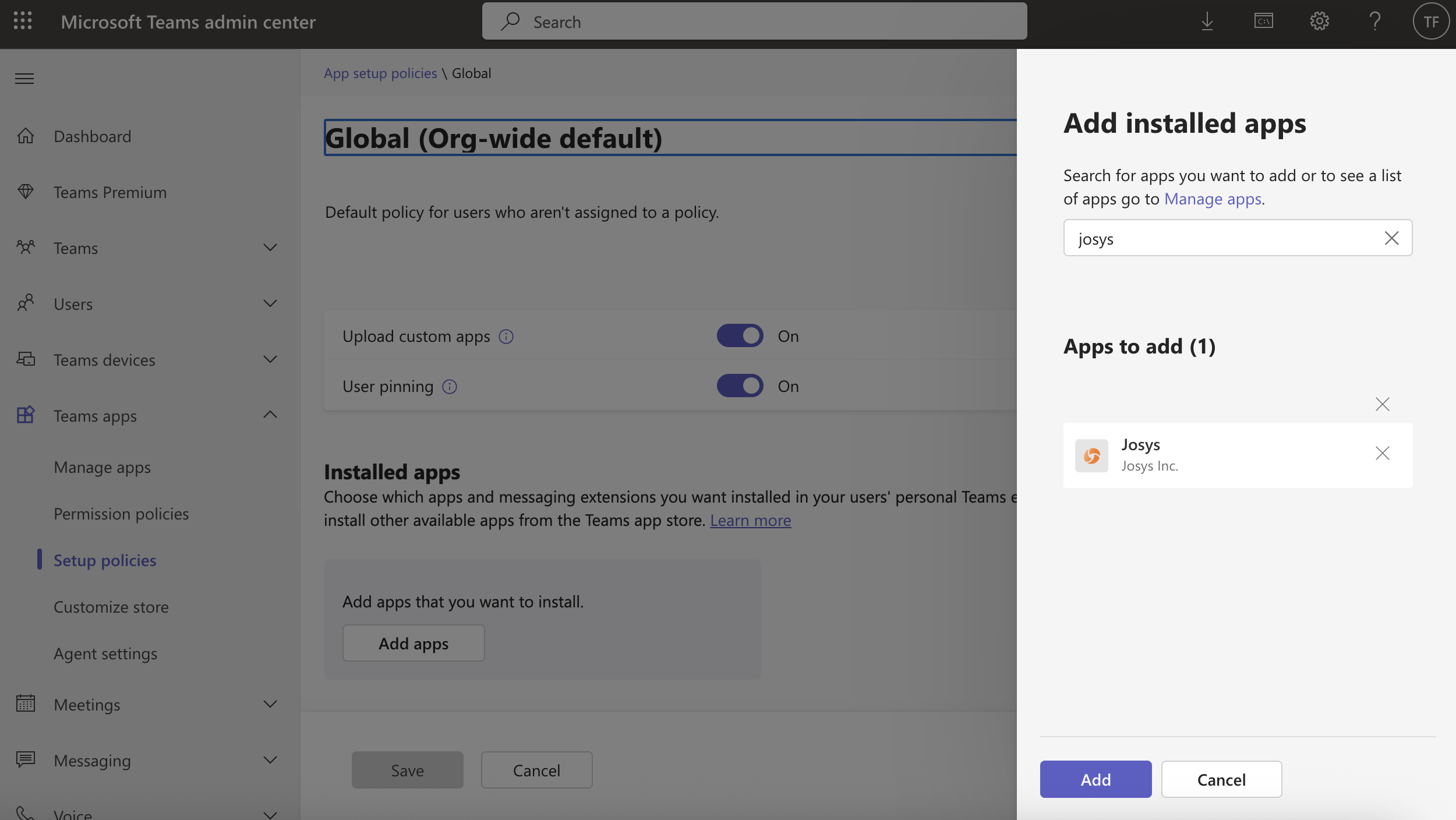 b. Navigate to Teams apps on the left and select Setup policies from Teams apps and click on Global (Org-wide default)