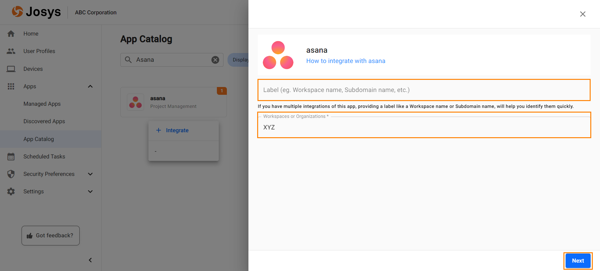 Step 1: Select Asana from the App Catalog in the Apps section.