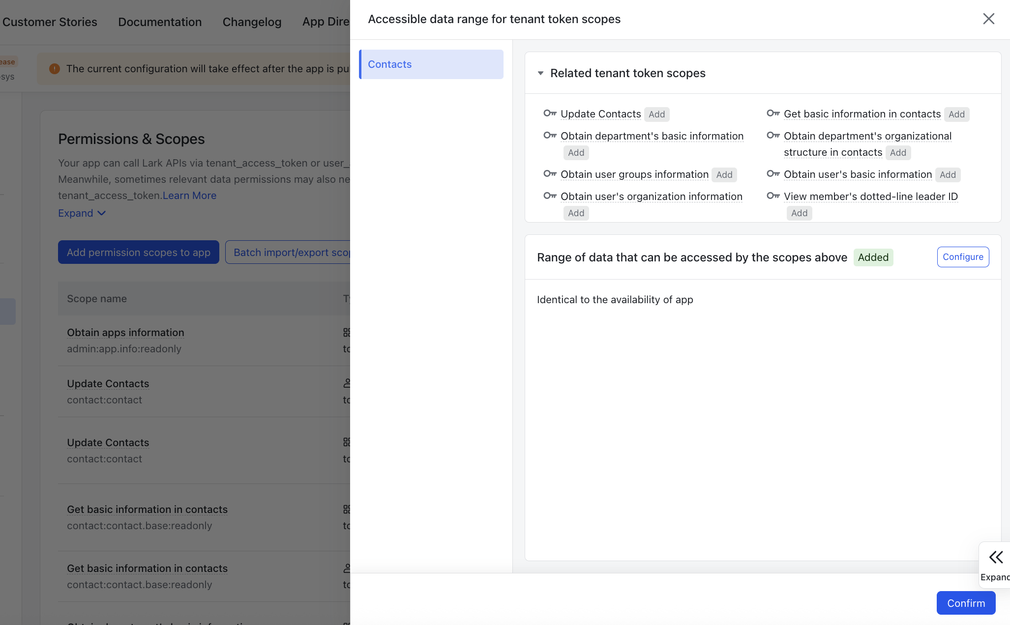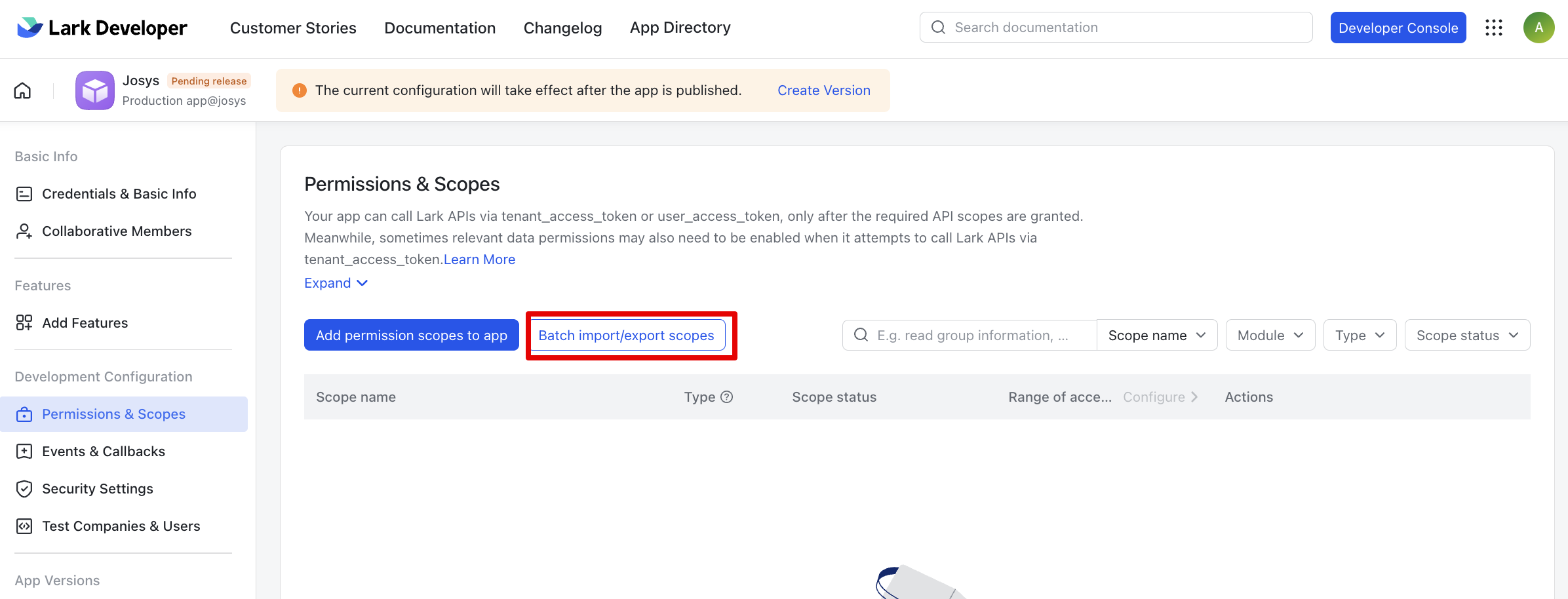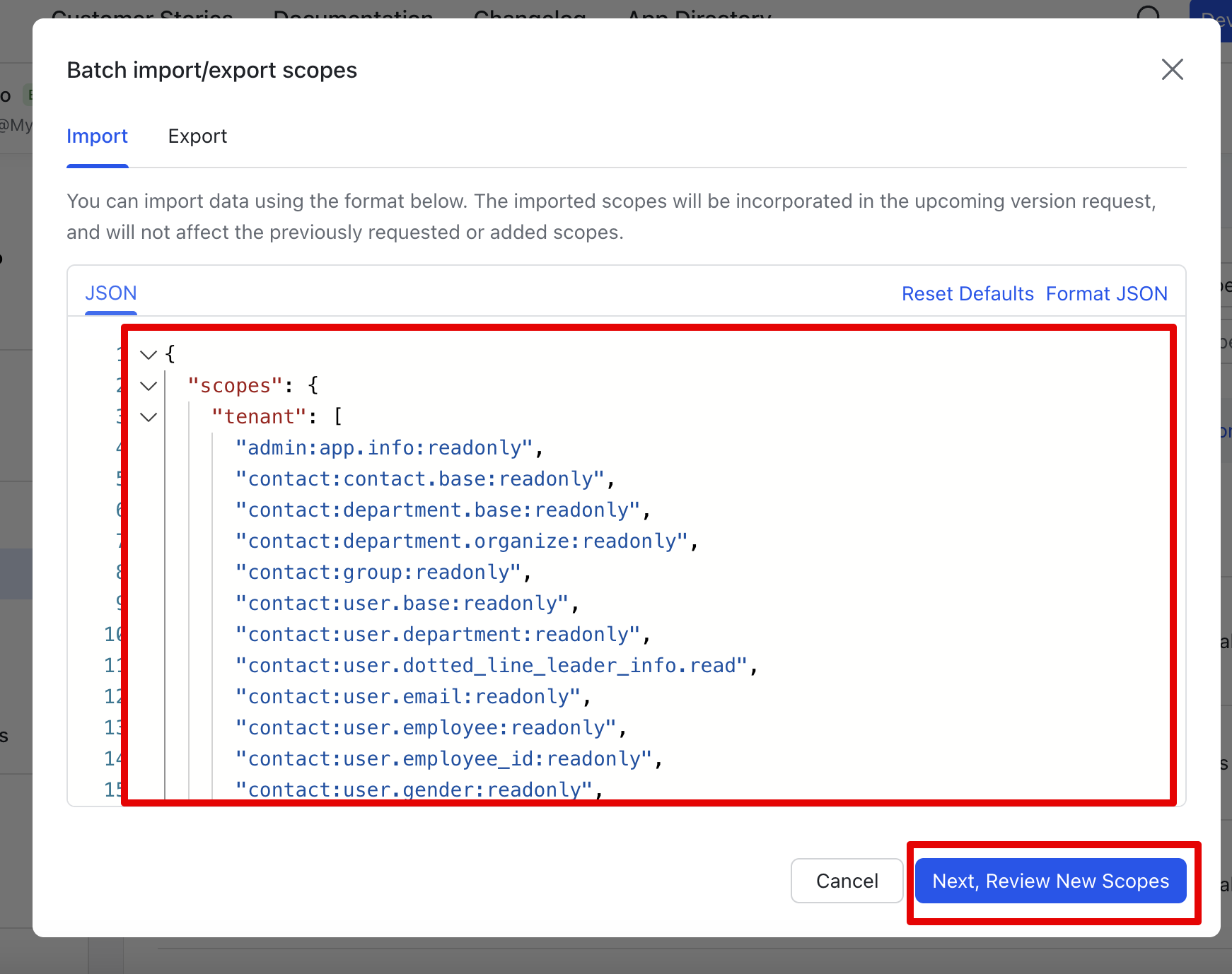 Step 4: Select the Permissions & Scopes option from Development Configuration. Click on Batch import/export scopes and copy and paste the following scopes in import tab. Click on Next, Review New Scopes and Click on Add.