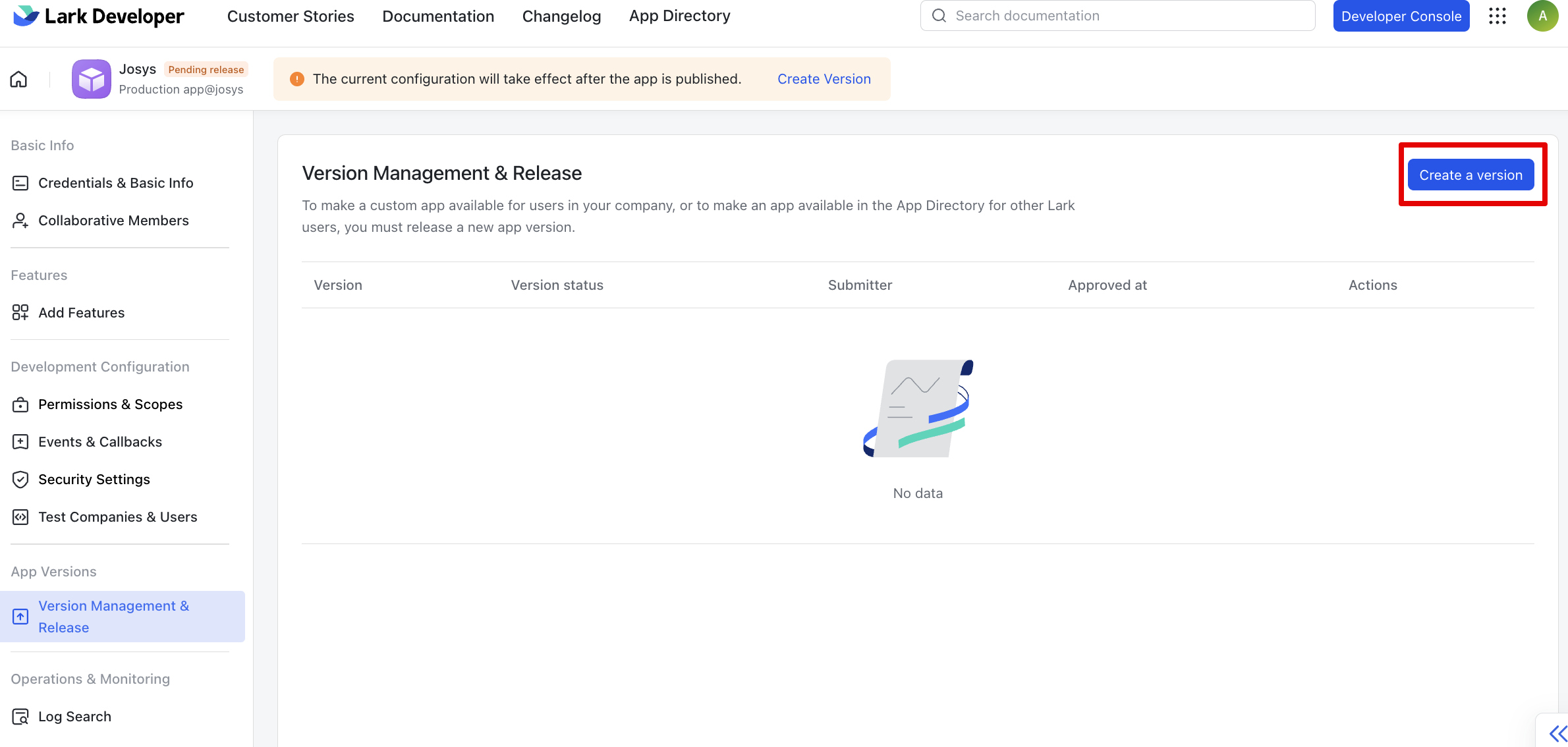 Step 7: Select the Version Management & Release option from App Versions and click Create a version.