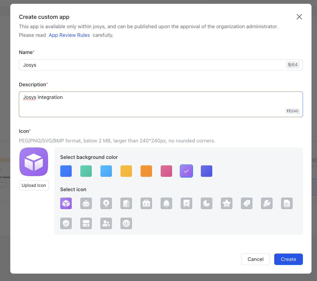 Step 3: Enter a Name and Description for the app, and select or upload a desired Icon. Click Create.