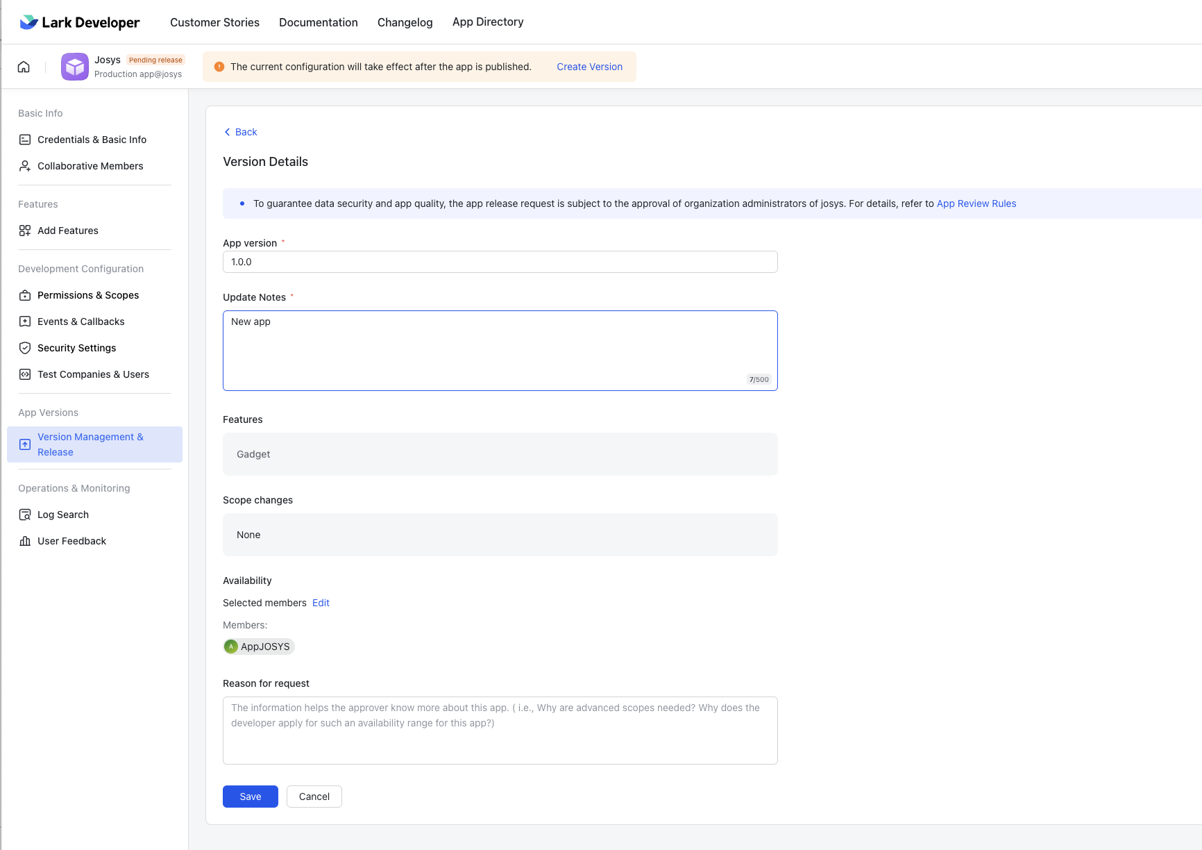 Step 8: Enter the App version, Update Notes, and click Save.