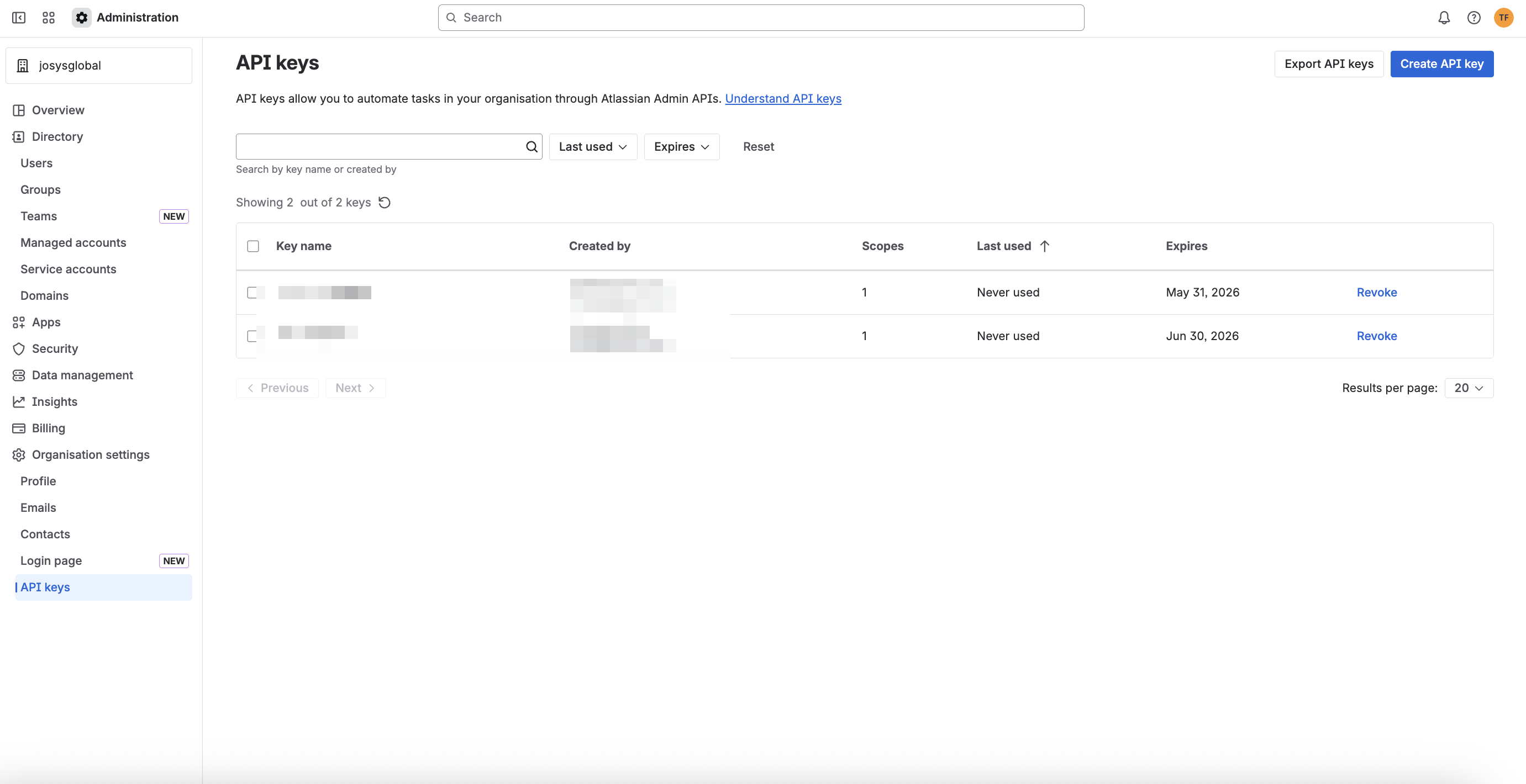 Step 1: Log in to Atlassian using an admin account. Select API Keys from Organization Settings.