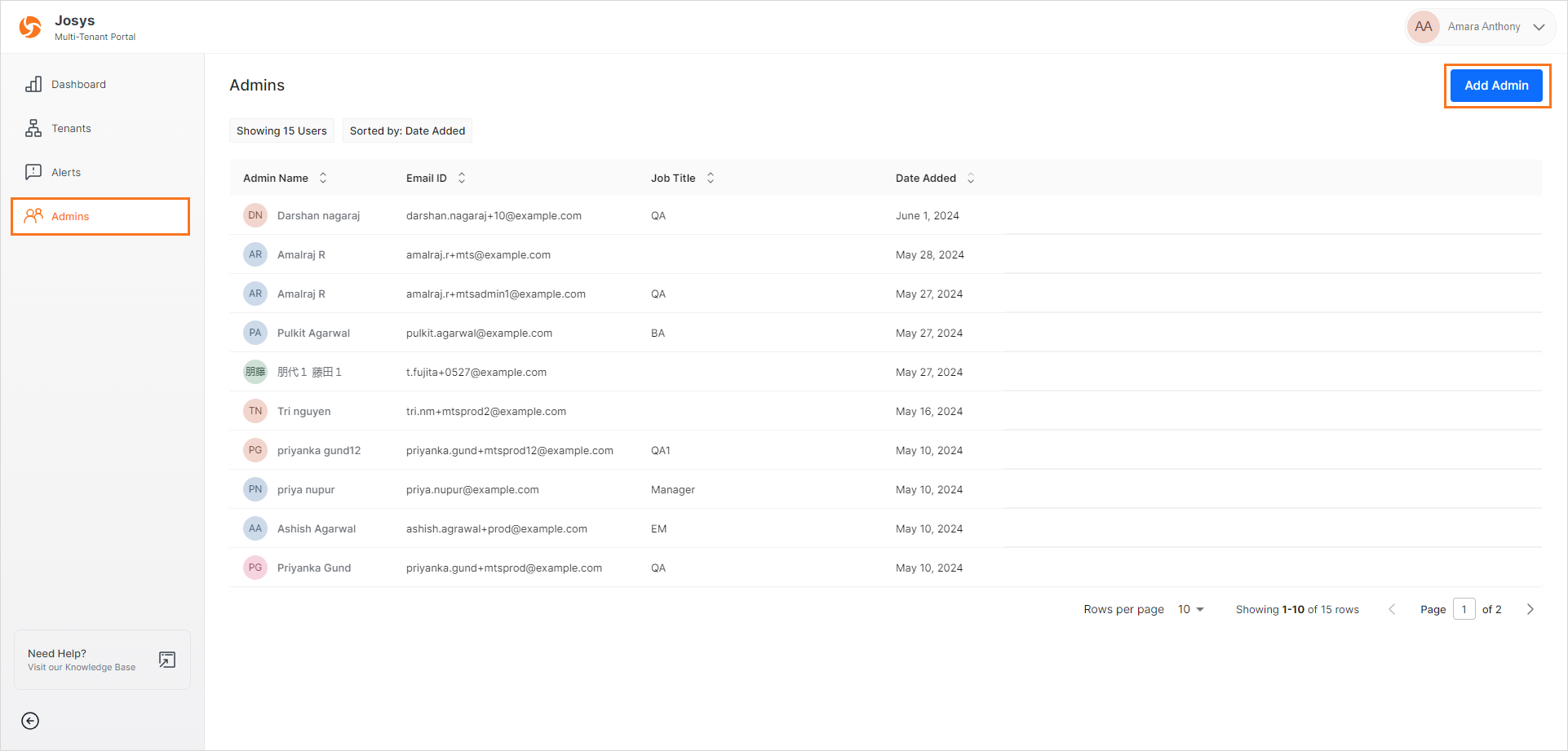 Step 1: Log in to your Josys Multi-Tenant Portal. Navigate to Admins in the left navigation pane. On this screen, you can view the Admin information, including the Admin Name, Email ID, Job title, and timestamp for when the Admin profile was created. Click Add Admins.