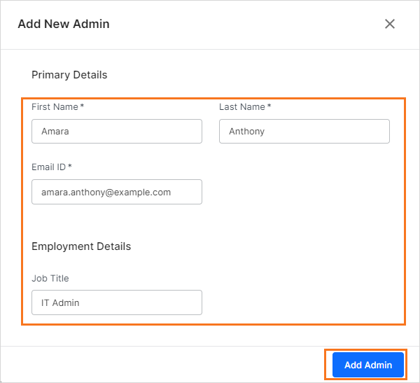 Step 2: Enter the admin's First name, Last name, Email ID, and Job Title to create the admin profile. Click Add Admin.