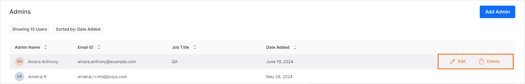 - Edit: Modify the admin details by clicking the Edit button and saving the changes.