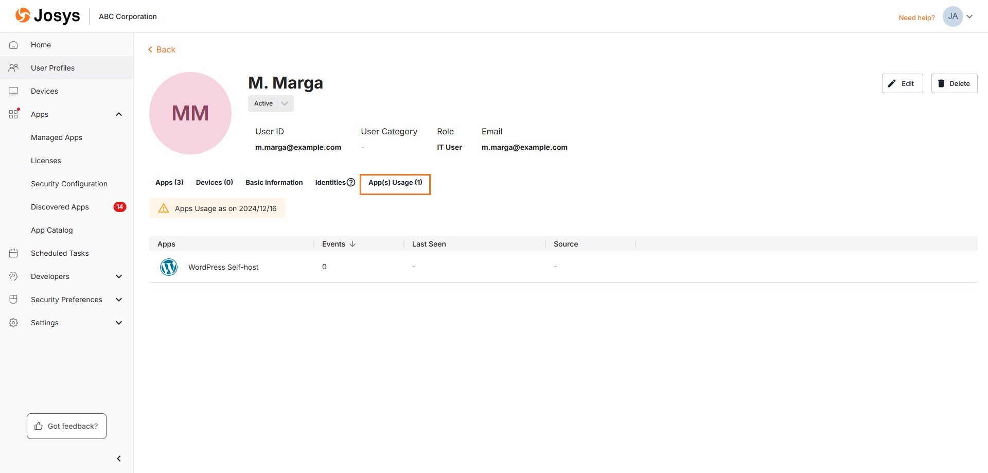 You can monitor individual app usage from the User Profiles. This section provides insights into which apps have been assigned to specific users and offers a breakdown of detected app usage.