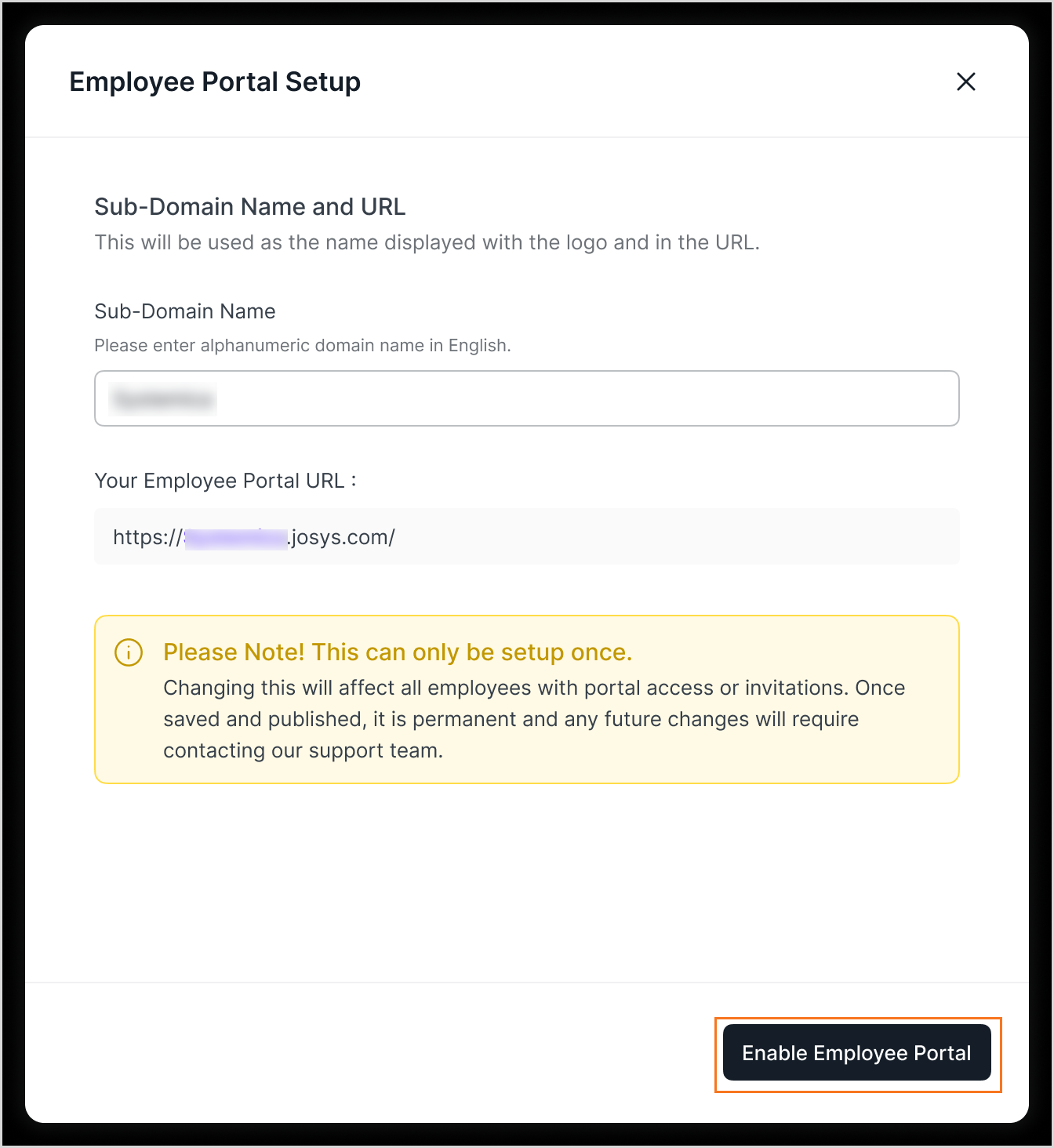 Step 4: Provide a sub-domain name and click Enable Employee Portal to start configuring the Employee Portal. Your Employee Portal URL will look like the one in the image below.