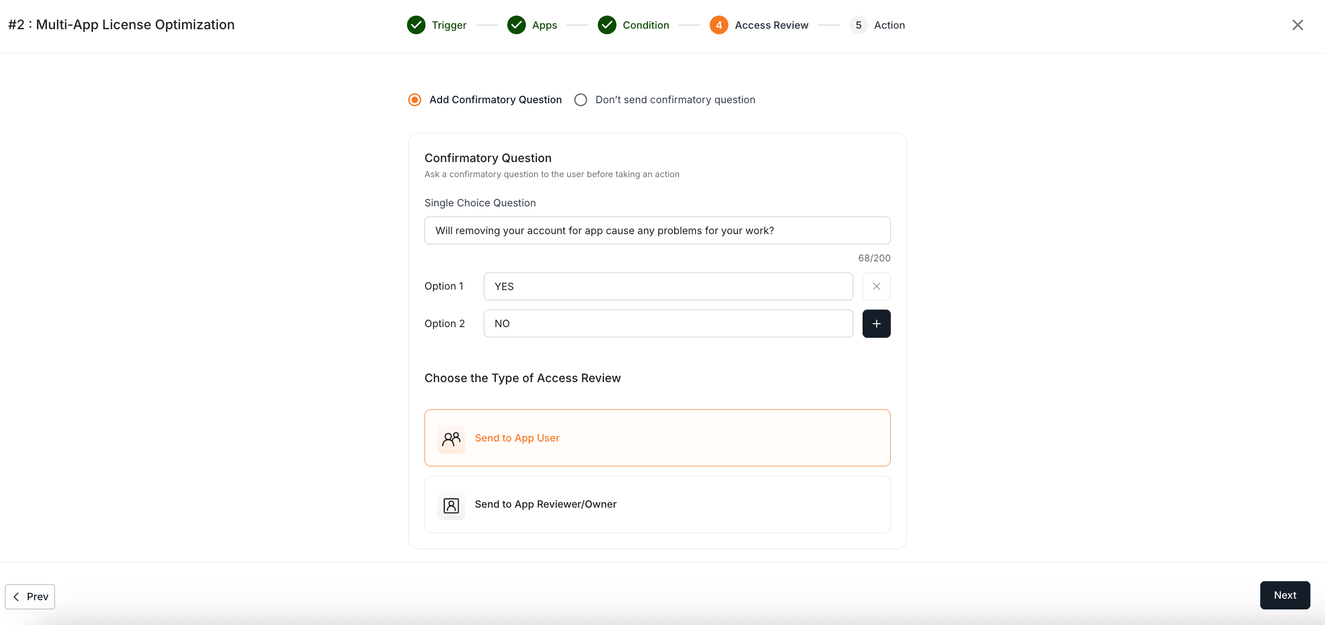 Step 6: On the Access Review screen, you can create a review step to ask a question and provide the necessary options to the user before taking any action. Select the App Reviewer/App Owners to assign the review request and click Next to proceed.