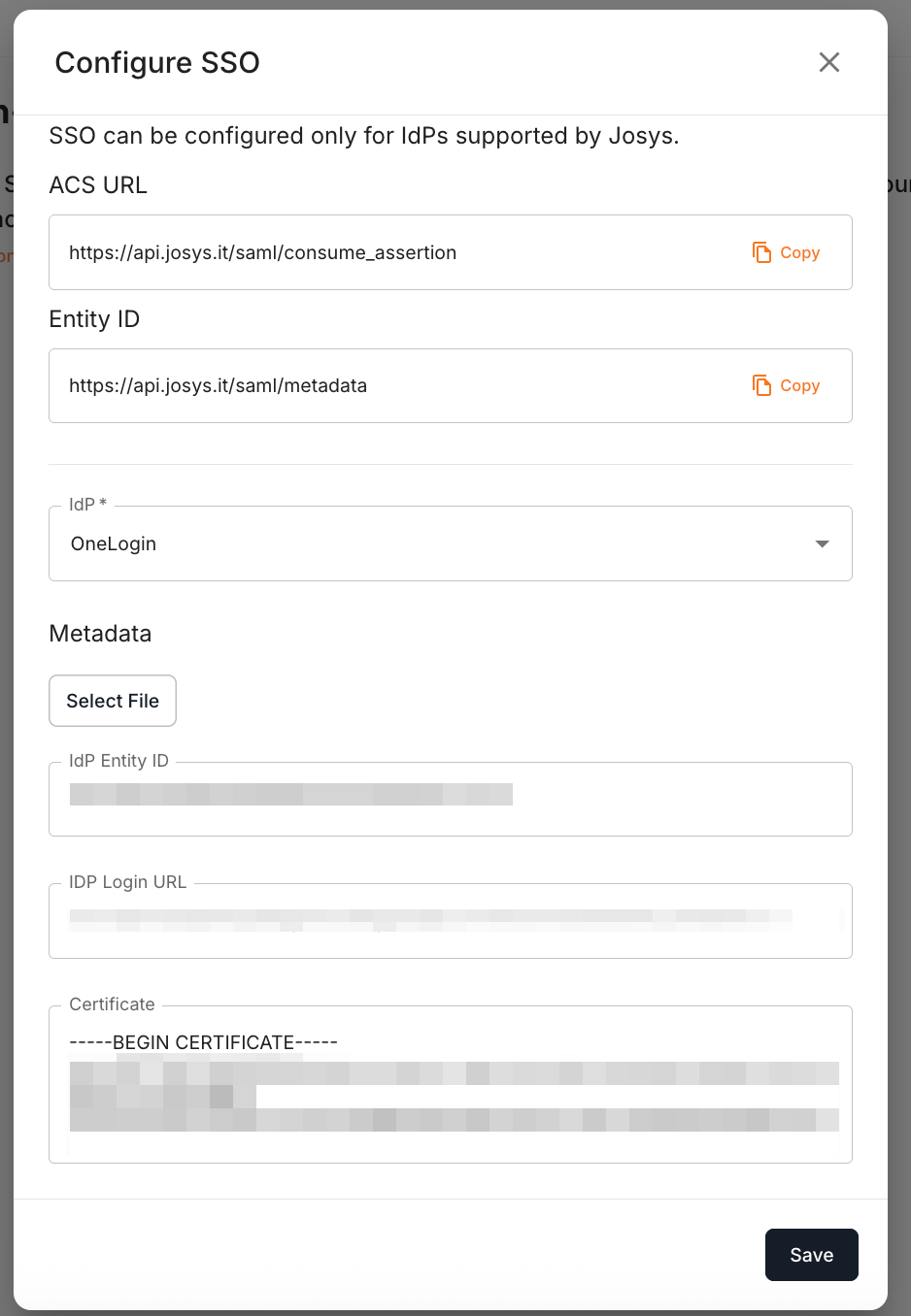 (To configure from a file, open the SSO menu, obtain the SAML metadata from the menu in the top-right corner of the screen, and upload it to Josys.)