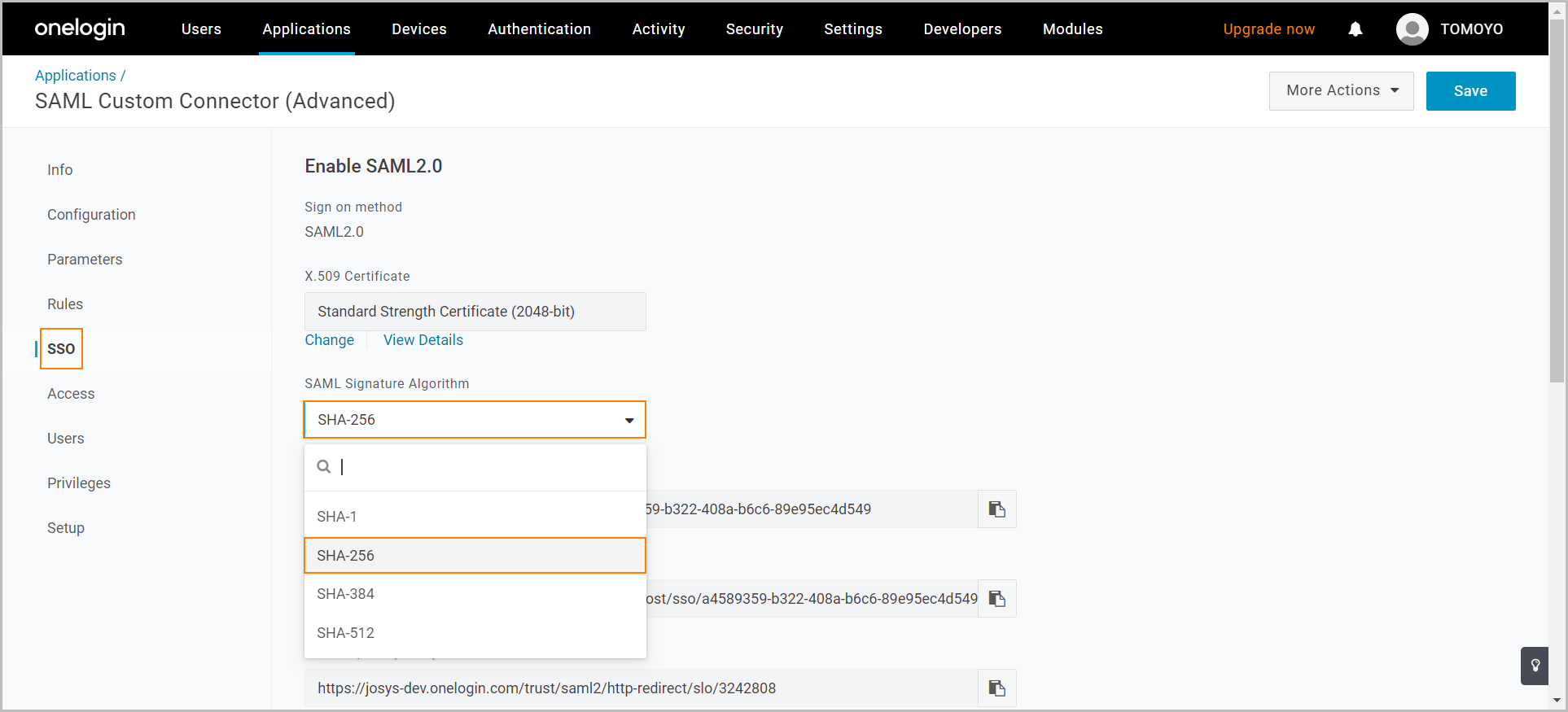 Step 7: Navigate to the SSO from the left menu. Select SHA-256 from the SAML Signature Algorithm dropdown and click Save.
