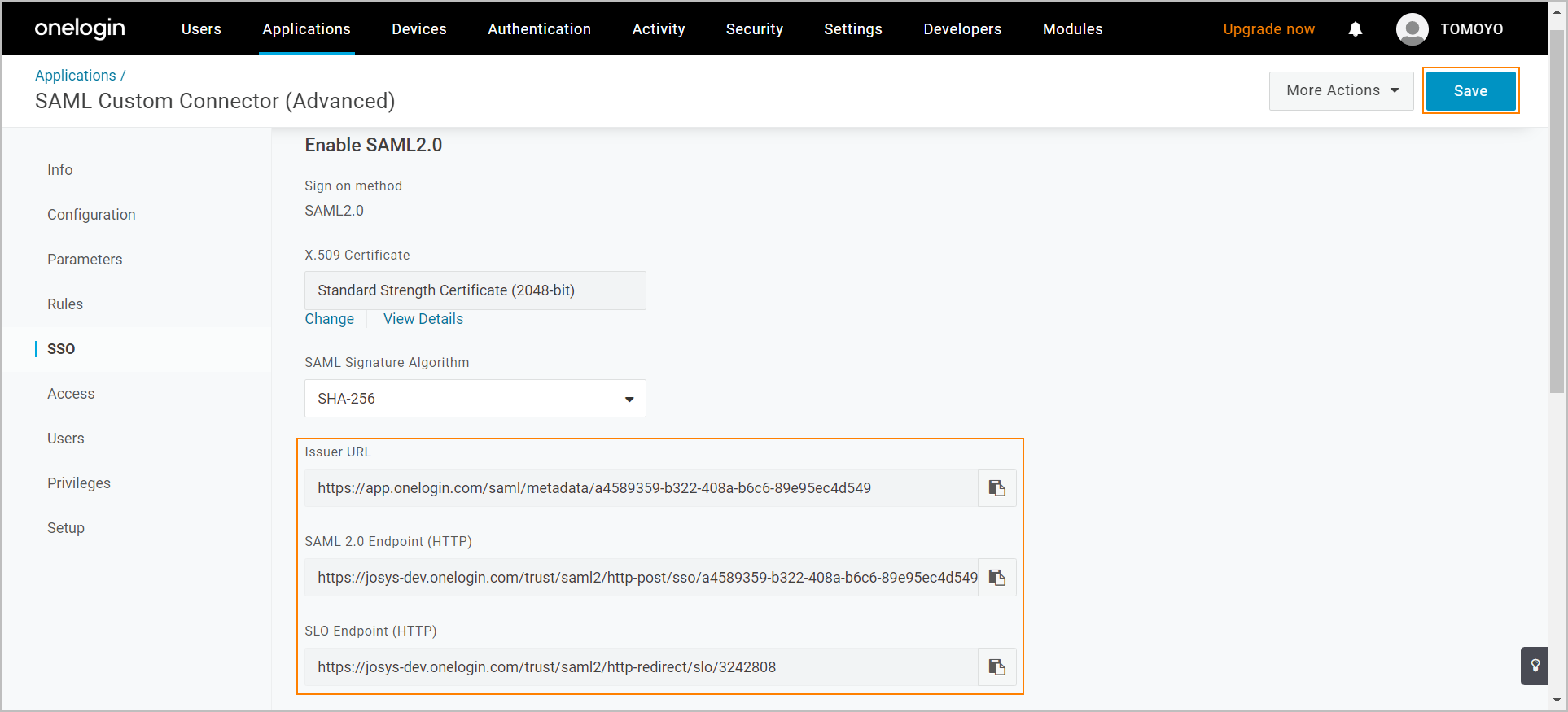 Step 8: Open SSO menu and copy and input the items shown on the screen to Josys.