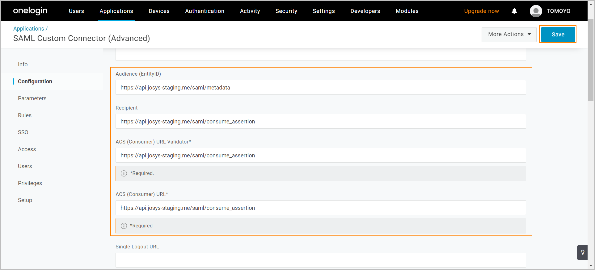 When copying and pasting from the screen, copy the following items from OneLogin and configure them on Josys.