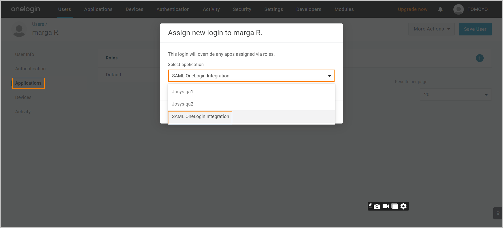 Step 11: Search and select the respective user to assign to the OneLogin.