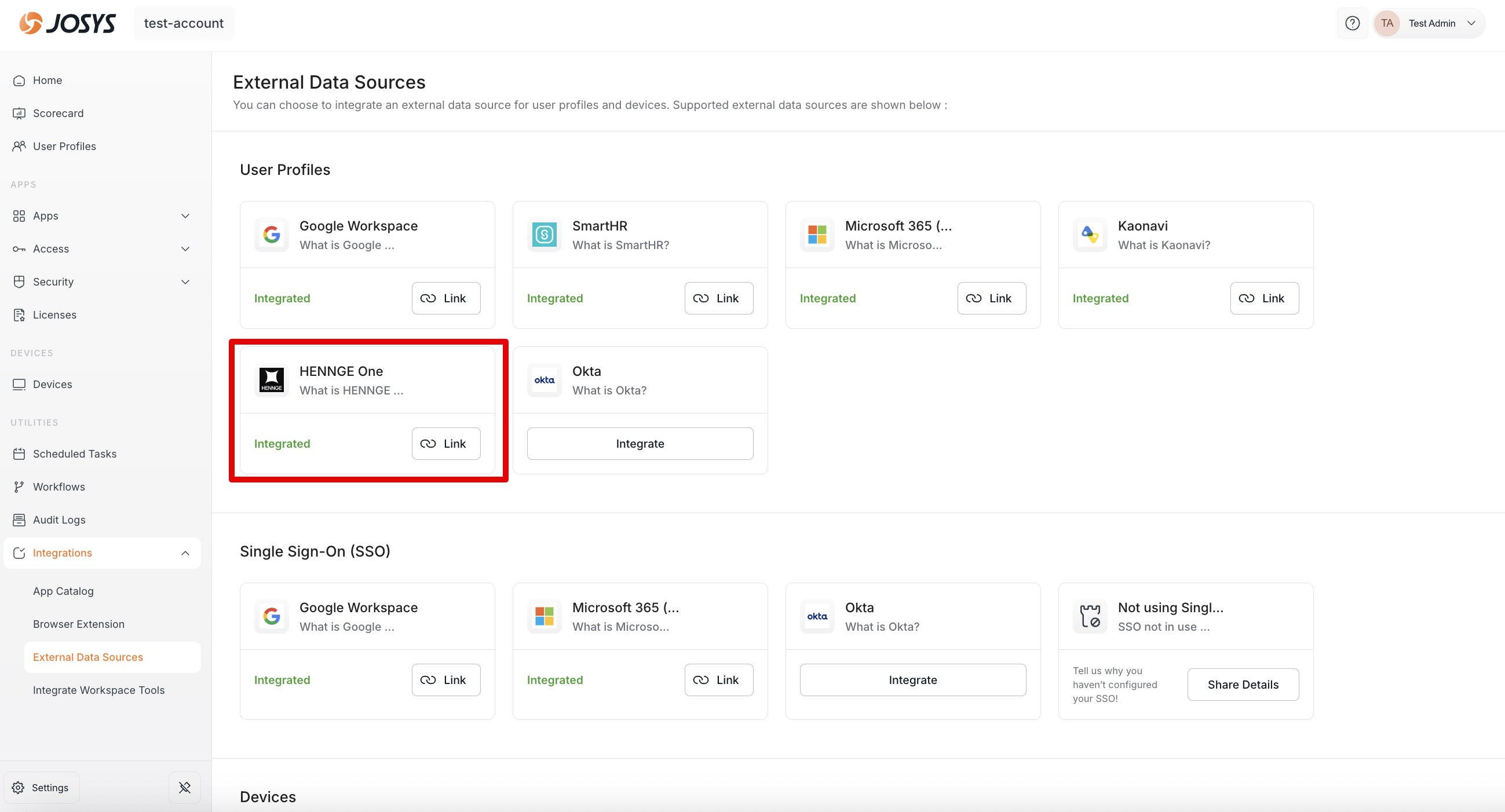 Step 1 : Go to Settings and select External Data Sources. Under User Profiles , click Link from HENNGE One.
