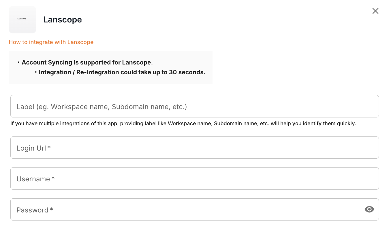 Step 2: Provide a suitable Label for identification. Enter the Login URL and your LANSCOPE Admin account credentials in their respective fields, then click Next to proceed.
