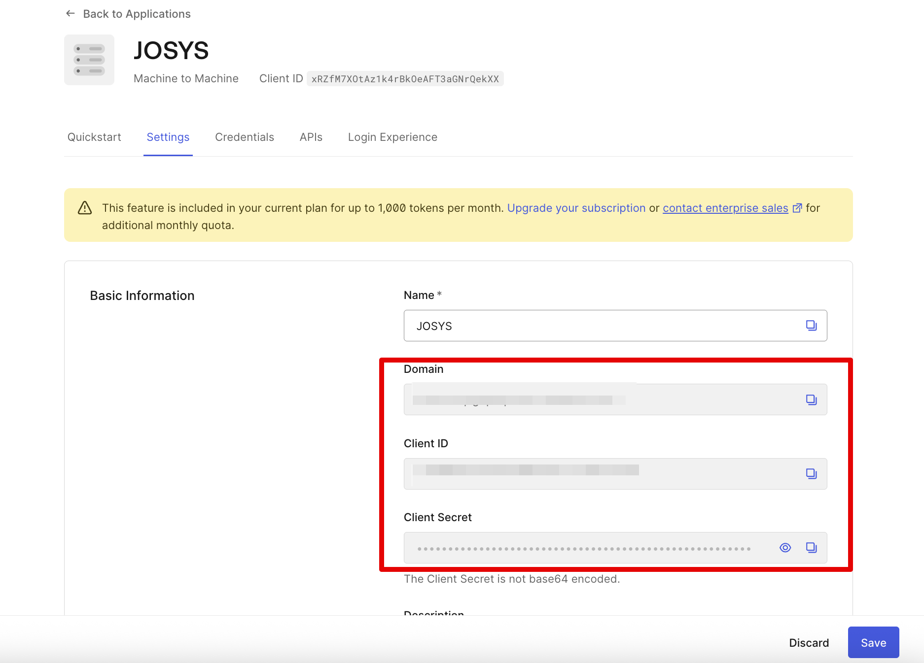 Step 3: Copy the Domain, Client ID and Client Secret as you will use it in the further integration steps.