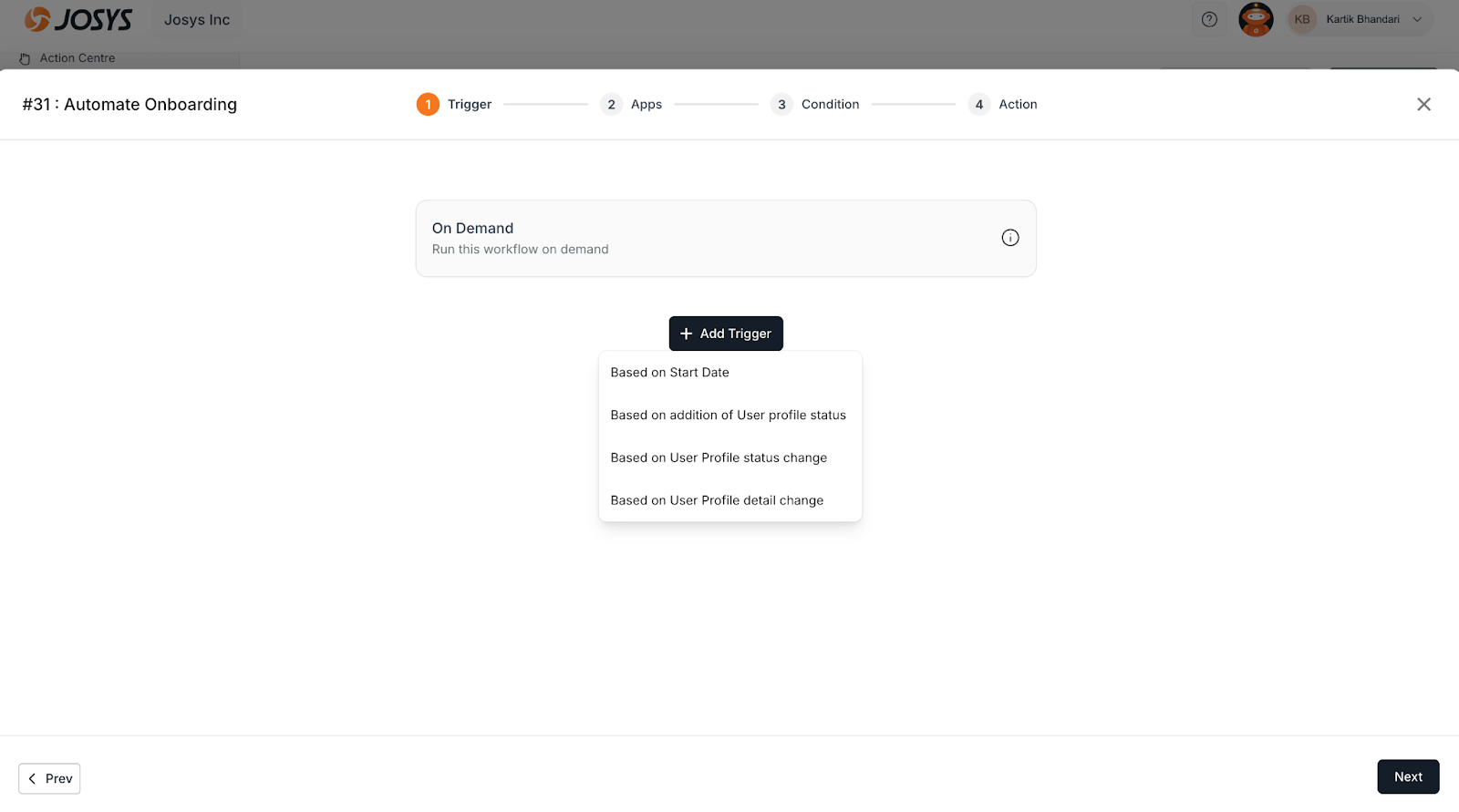 Step 3: The workflows that support manual trigger has “On Demand” by default in Trigger section. Additional triggers can be configured additionally.