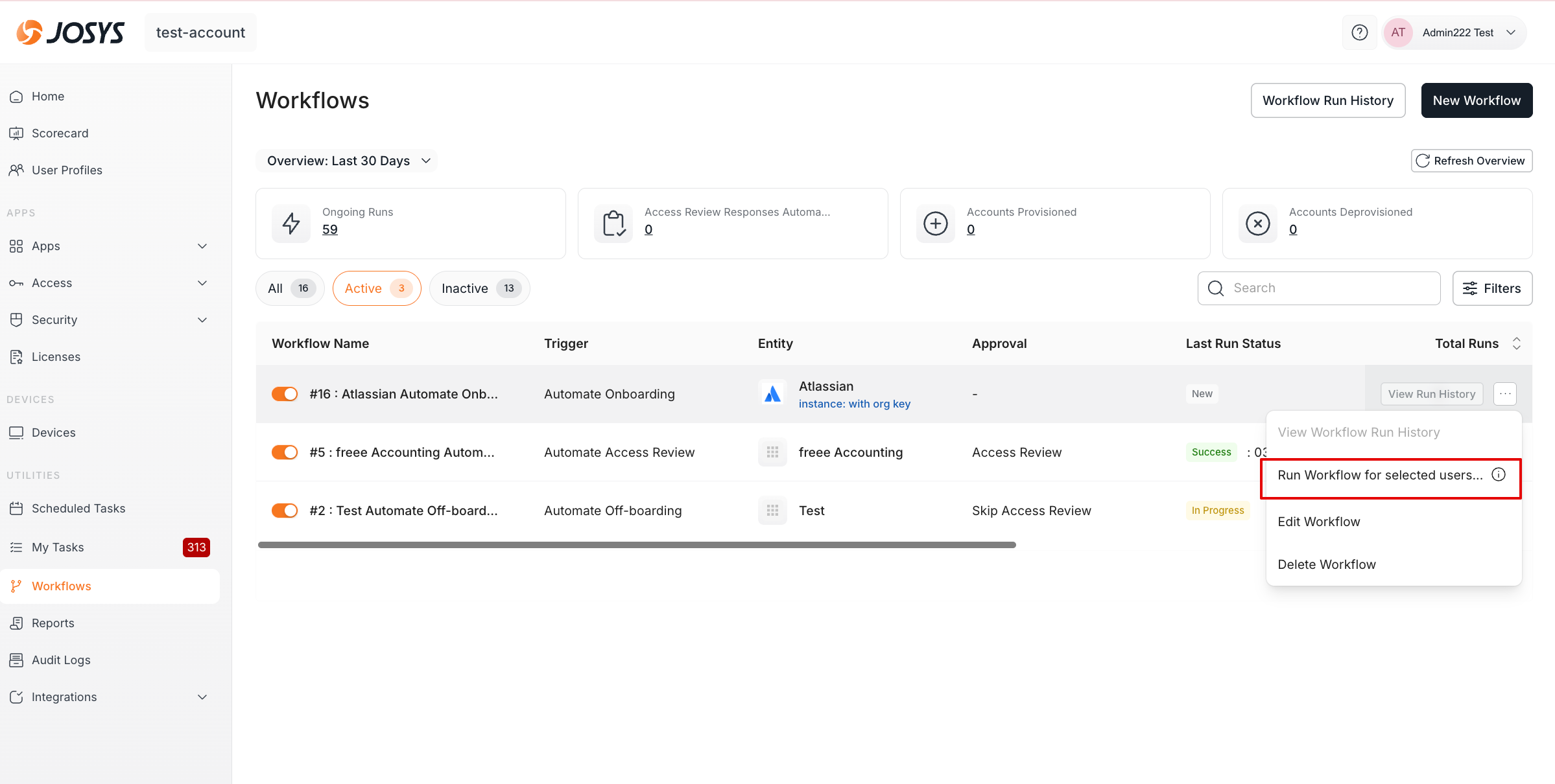 Step 4: Once the Workflow is created, navigate to the Workflow listing page, click on more options and select "Run workflow for selected users".