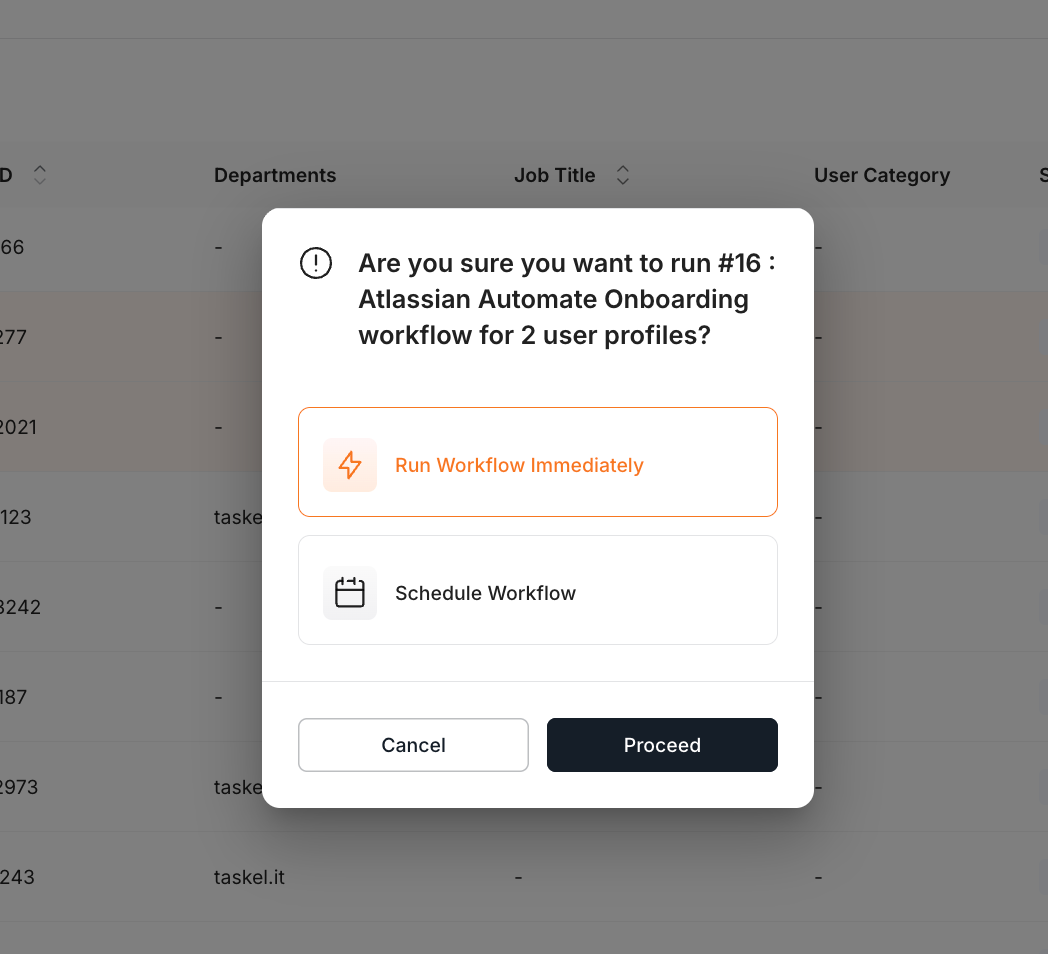 Step 5: Choose the users and click on "Run workflow". You also have the option to run it immediately or schedule it for later.